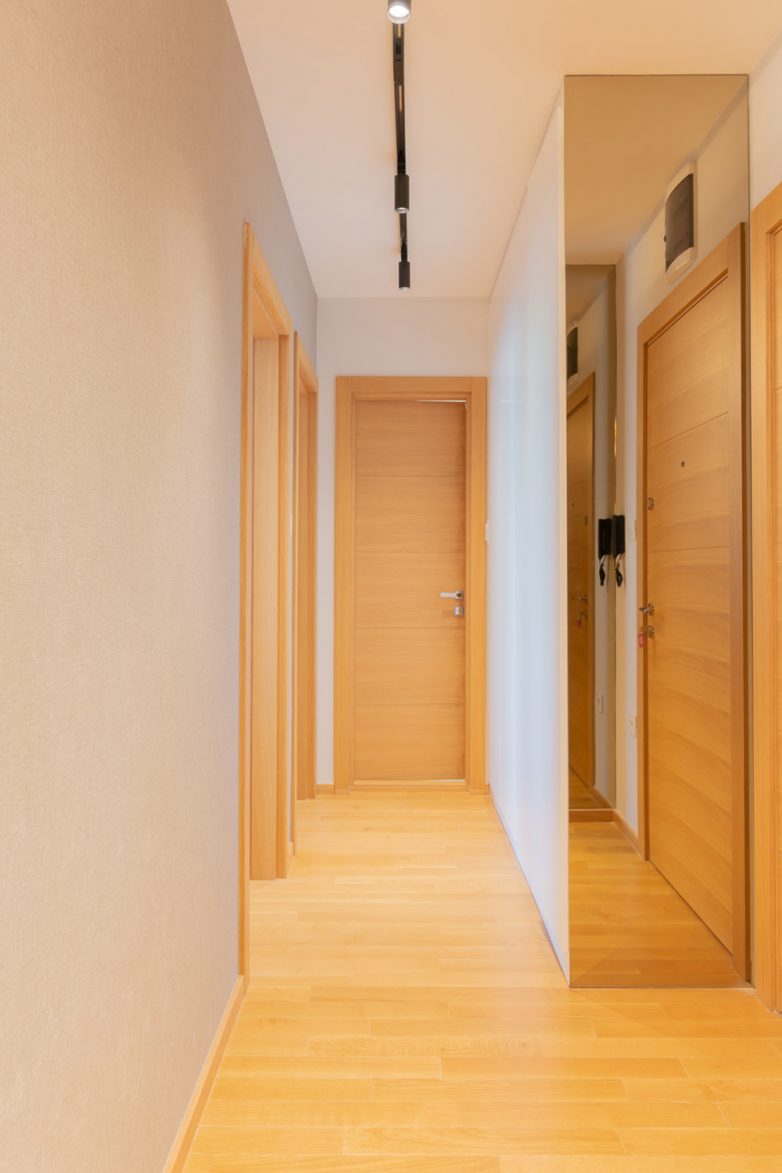 U hodniku je jednostavan orman sa dim staklima na bočnim stranicama ormara. Dim staklo se pojavljuje i u spavaćoj sobi sa bočne strane kreveta. Sa druge strane su lestvice na zidu koje su naglašene visilicom ispred njih.