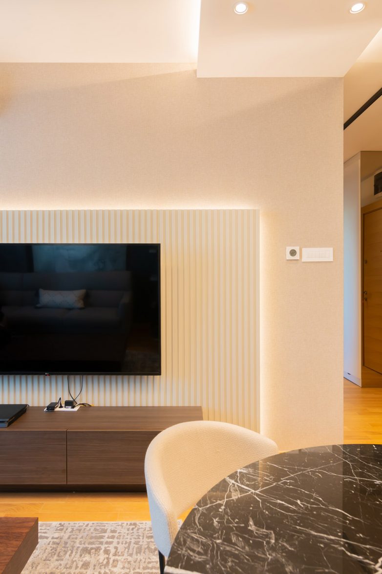 Zid oko televizora oblikovan je tapetom i sa zidnom oblogom iza koje su skriveni kablovi. Oko zidne obloge je LED traka koja dodatno ističe teksturu površine zida. Tapeta s teksturom tkanine je sjajno rešenje ako želite da utoplite atposferu doma.