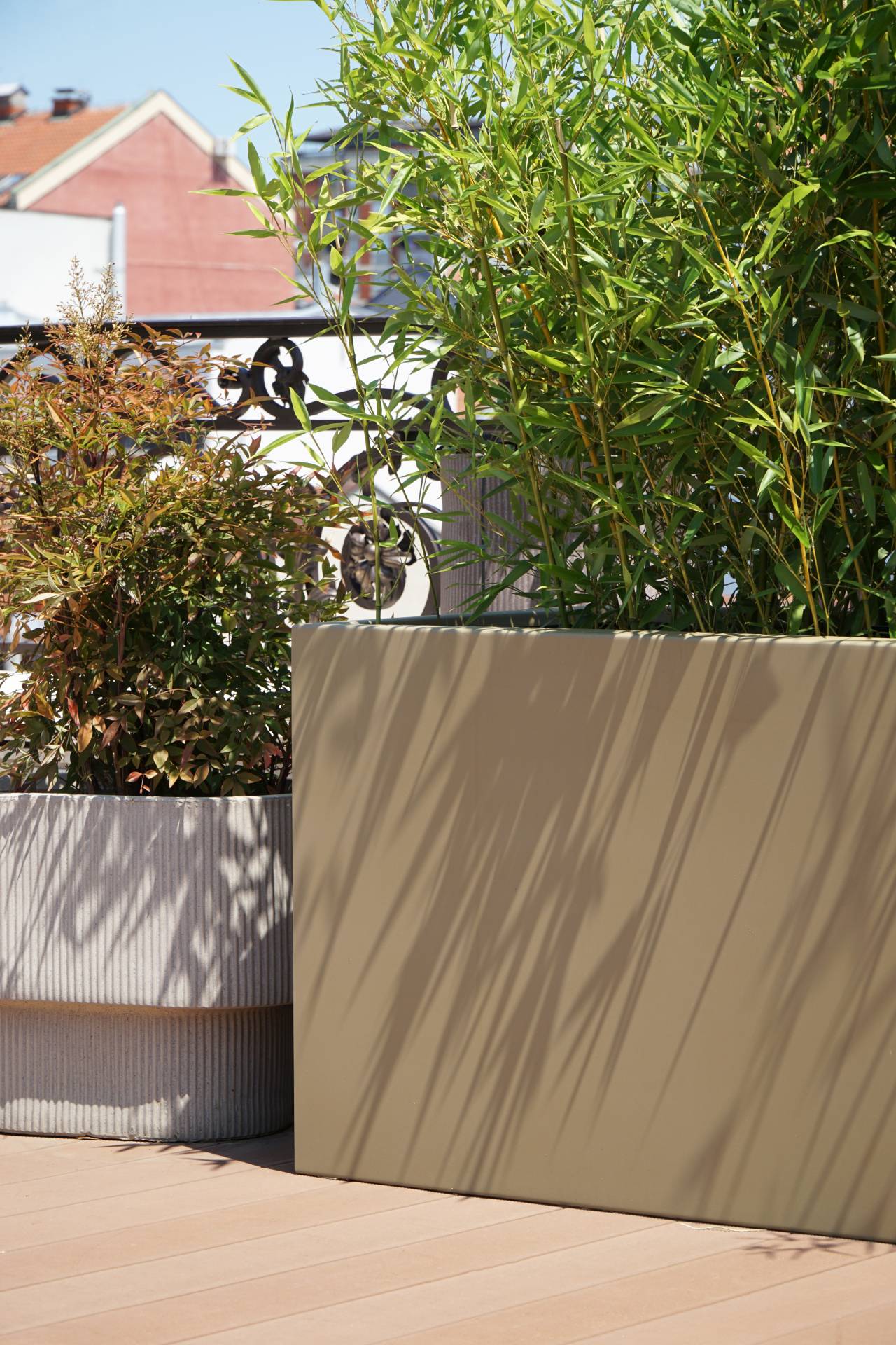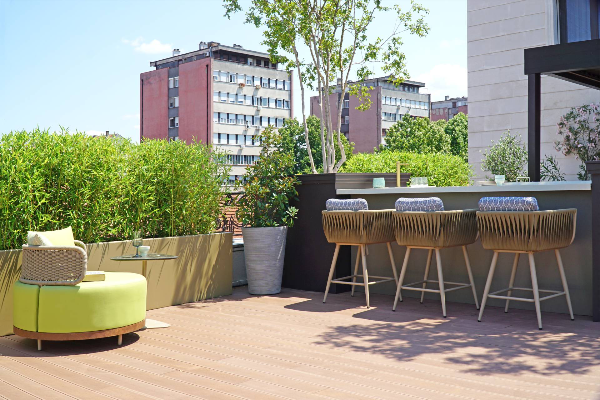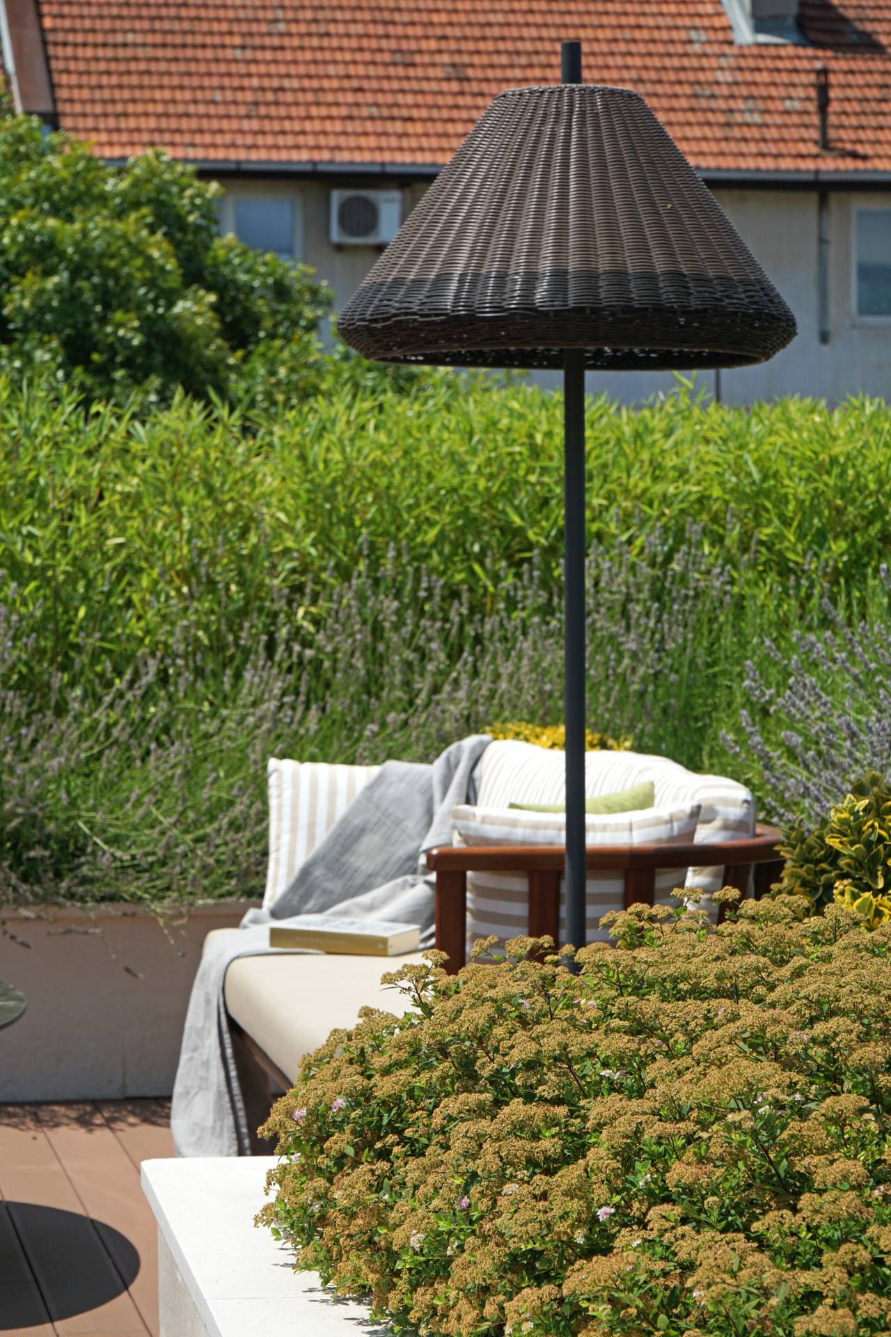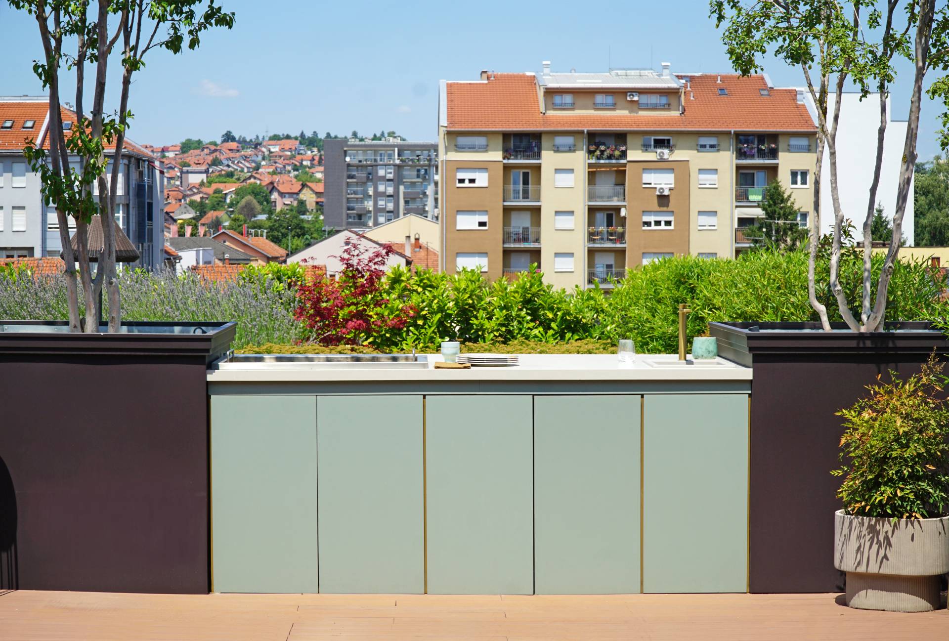 Krovna terasa od 220 kvadrata zamišljena je kao ravnopravan deo kuće. Projekat potpisuju Dejan Popov i Landscape Factory Studio, koji su eksterijer tretirali kao spoljašnju dnevnu zonu, sa kuhinjom, trpezarijom, “lounge” prostorima i pažljivo komponovanim zelenilom.