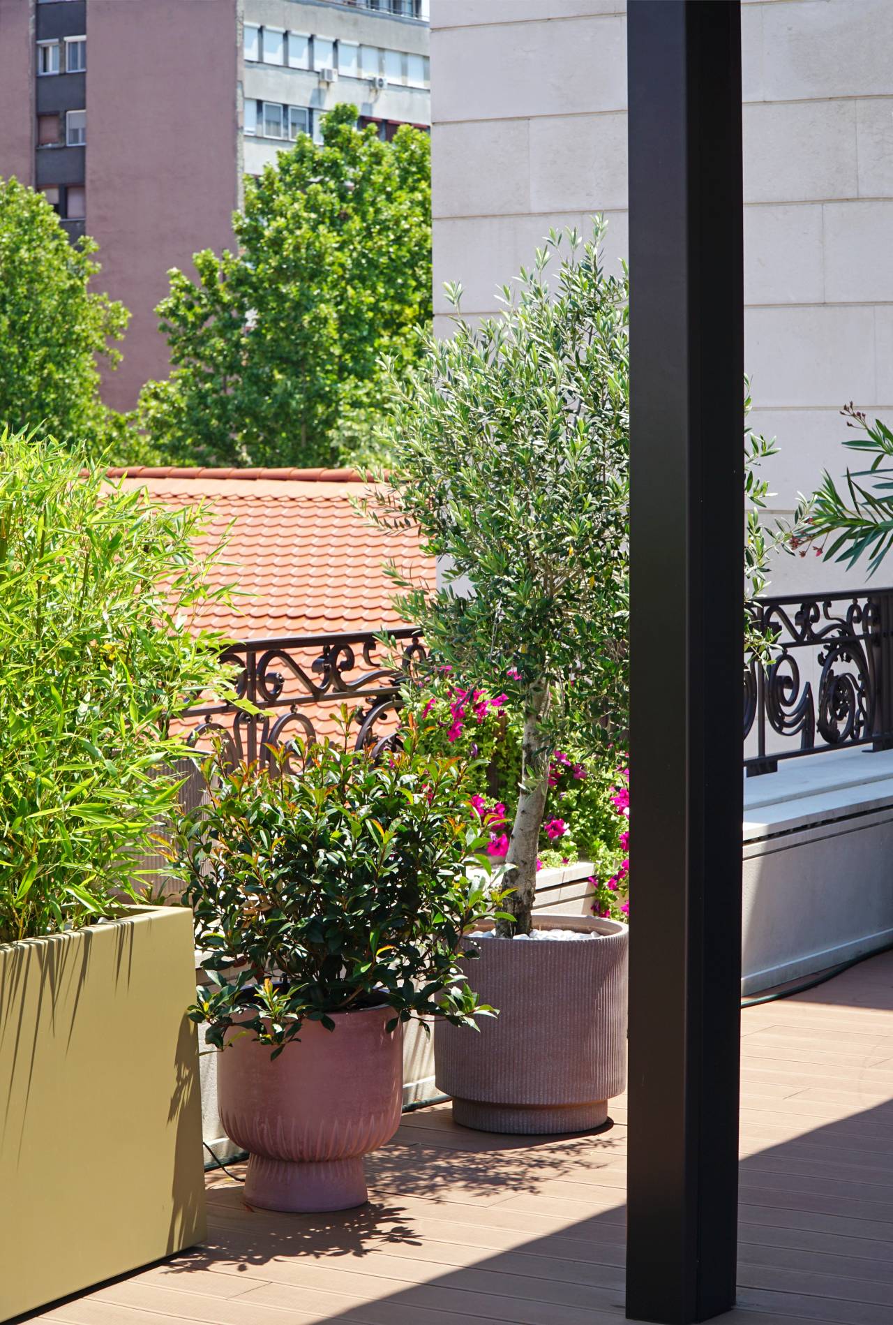 U kombinaciji sa suptilnom rasvetom i pažljivo odabranim materijalima, terasa dobija karakter intimnog urbanog vrta izdignutog iznad grada, uz jasnu povezanost sa prirodom.