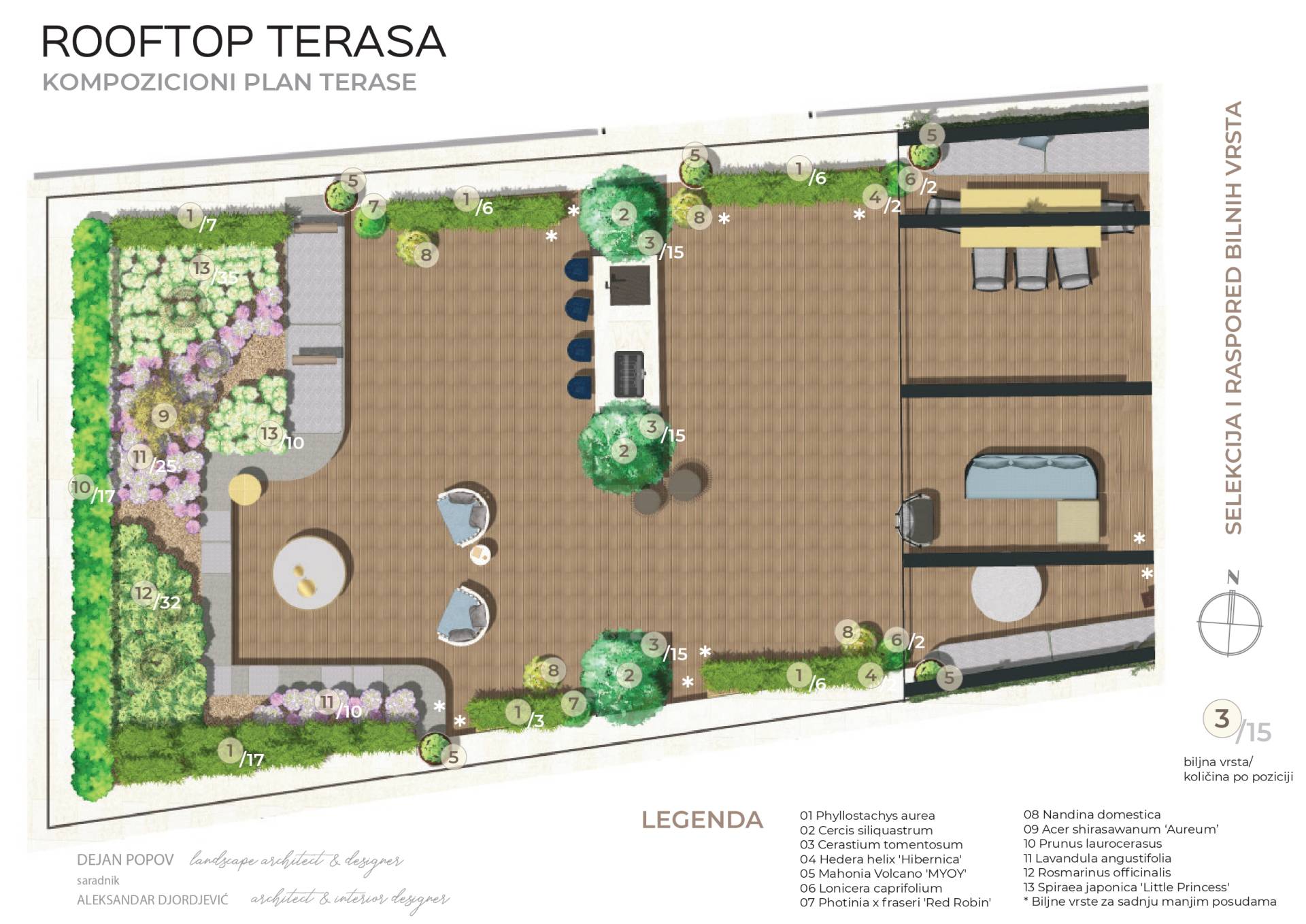 Posebna pažnja posvećena je pejzažnom konceptu, a biljke su tretirane kao aktivan element organizacije prostora. Visoko zelenilo duž oboda terase filtrira poglede i ublažava kontakt sa okolinom.