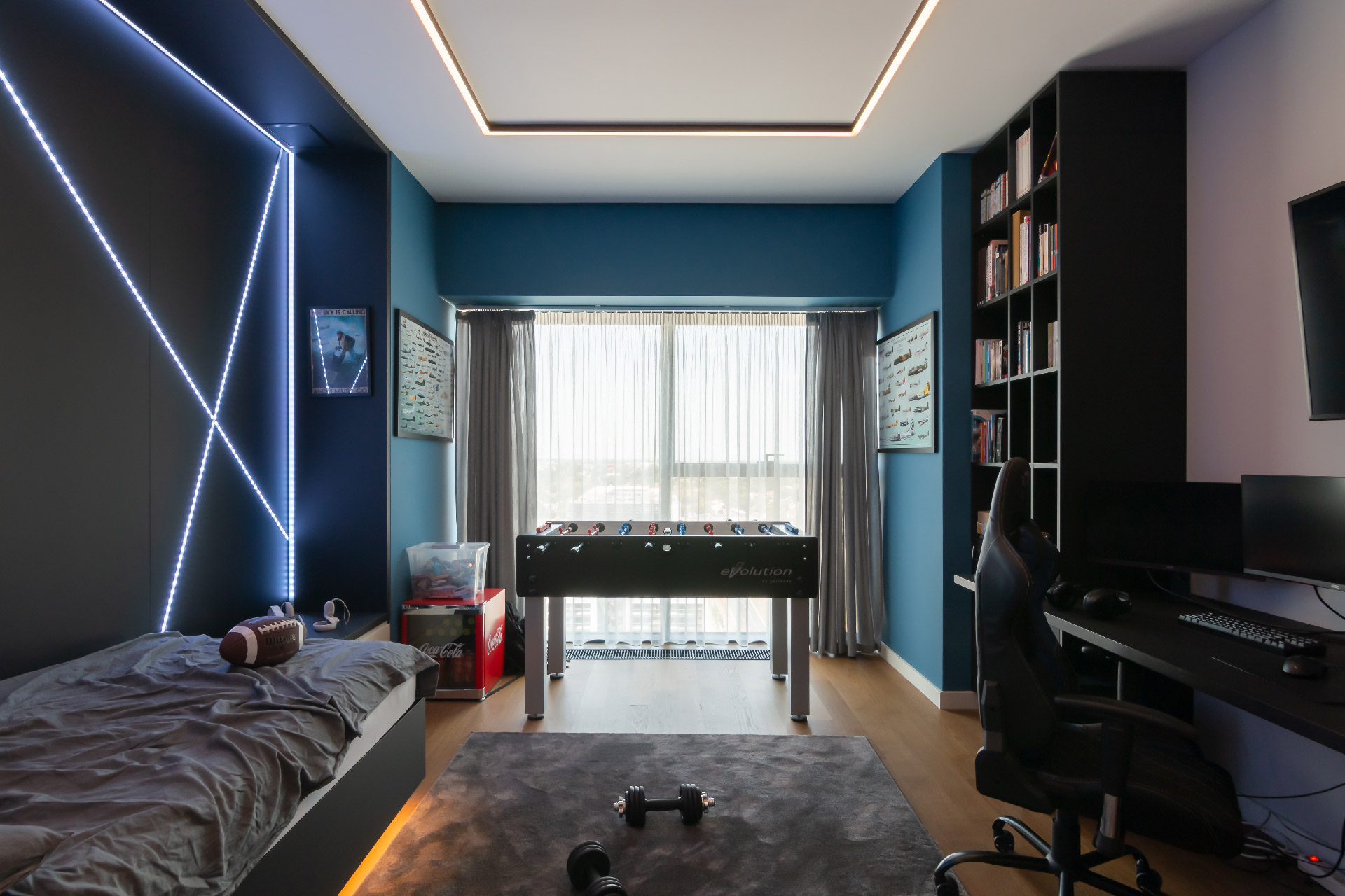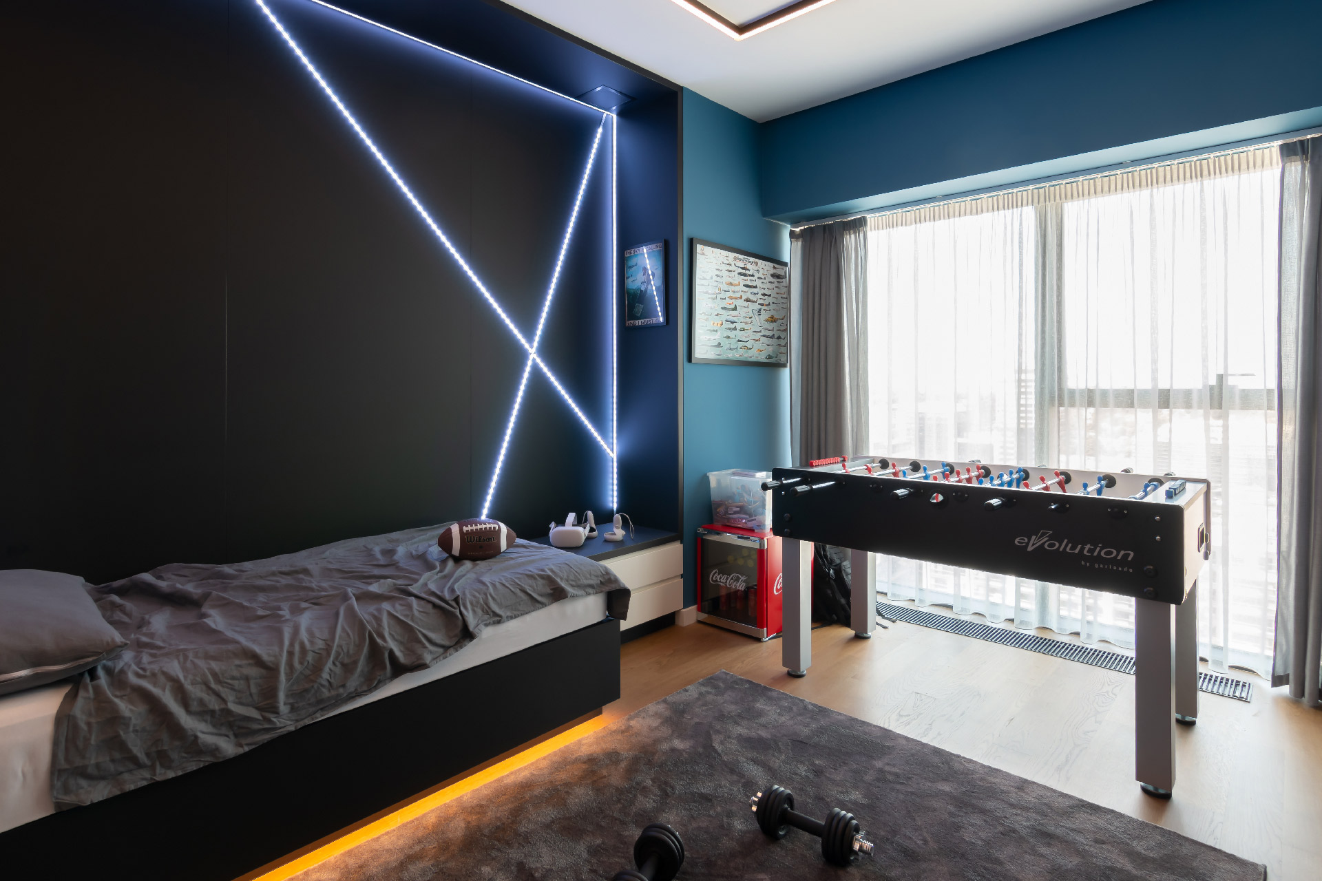 Spavaća soba za tinejdžera je projektovana u tamnim tonovima kako bi se podstakla gejming atmosfera.