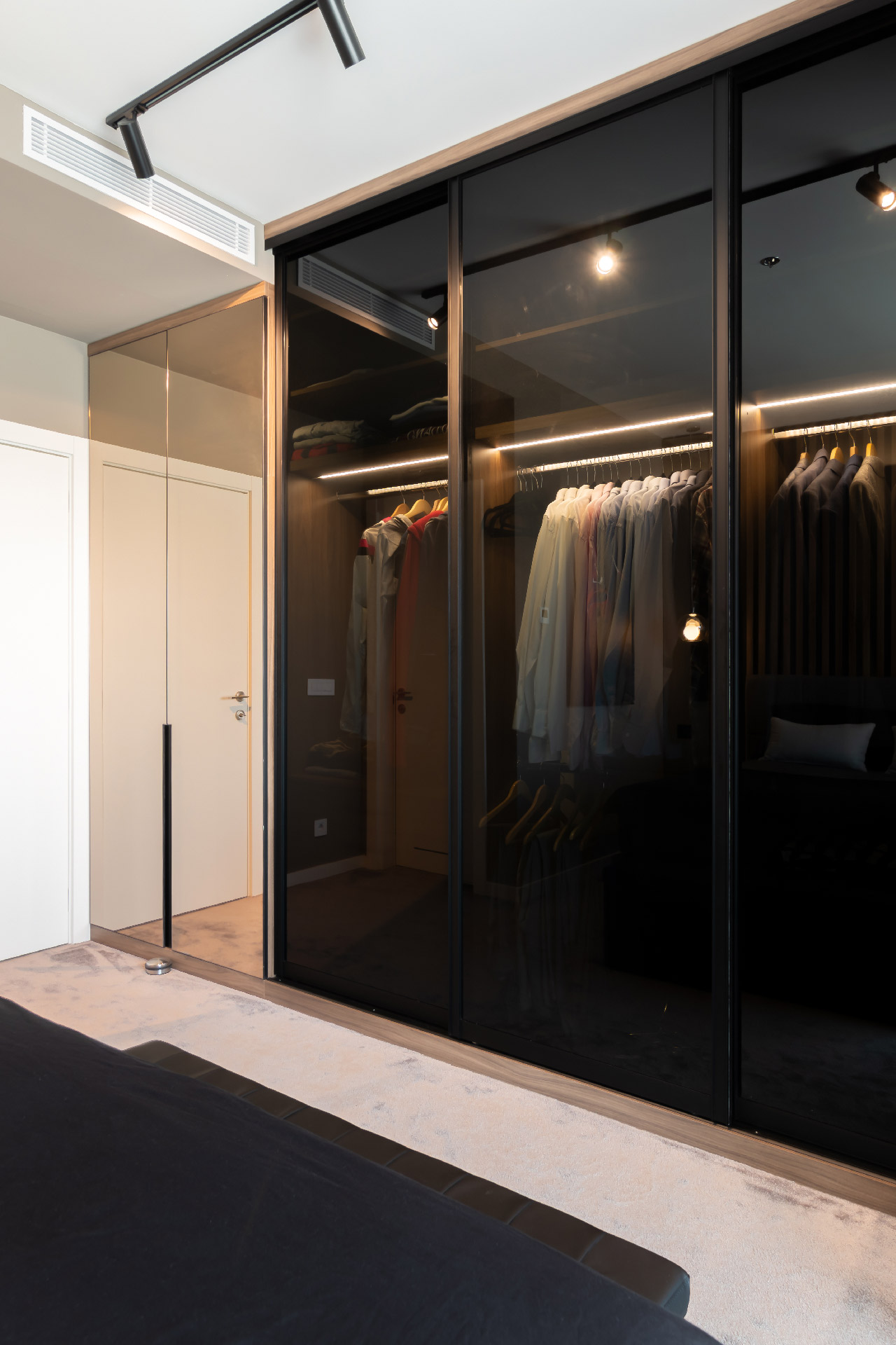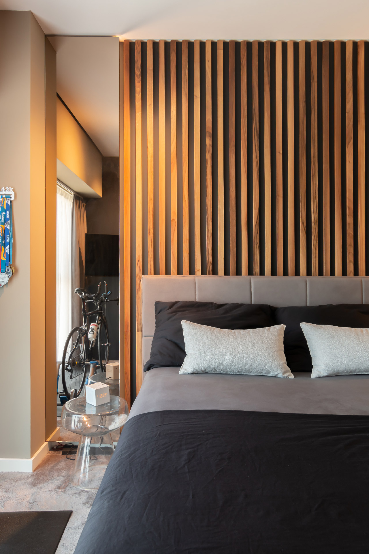 Master soba je takođe izvedena u tamnijim tonovima, a zahtev vlasnika jeste bio i smeštanje trenažnog bicikla u sobi. Bicikl je našao mesto pored prozora naspram kojeg je postavljen manji ekran koji pomaže vežbanju.