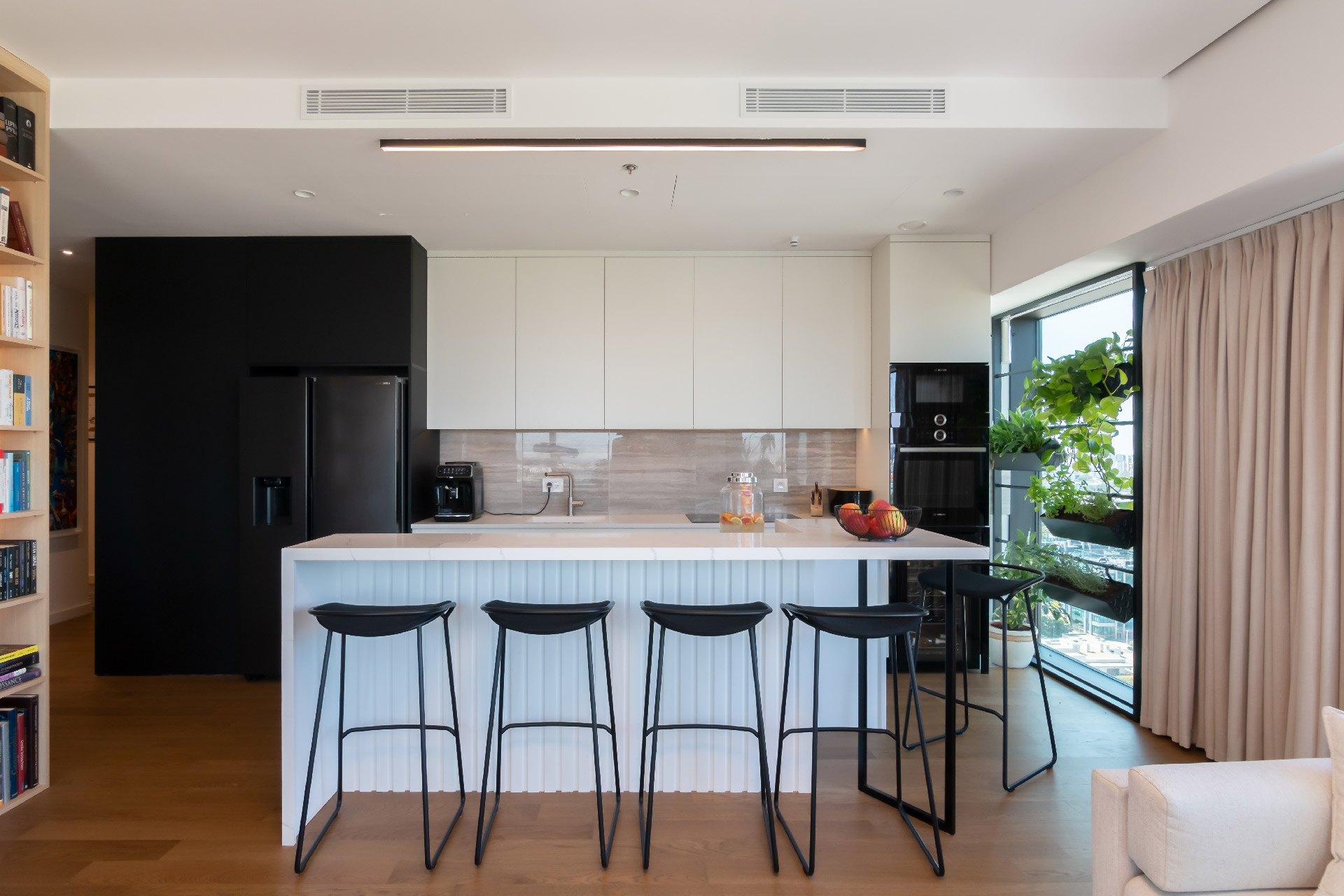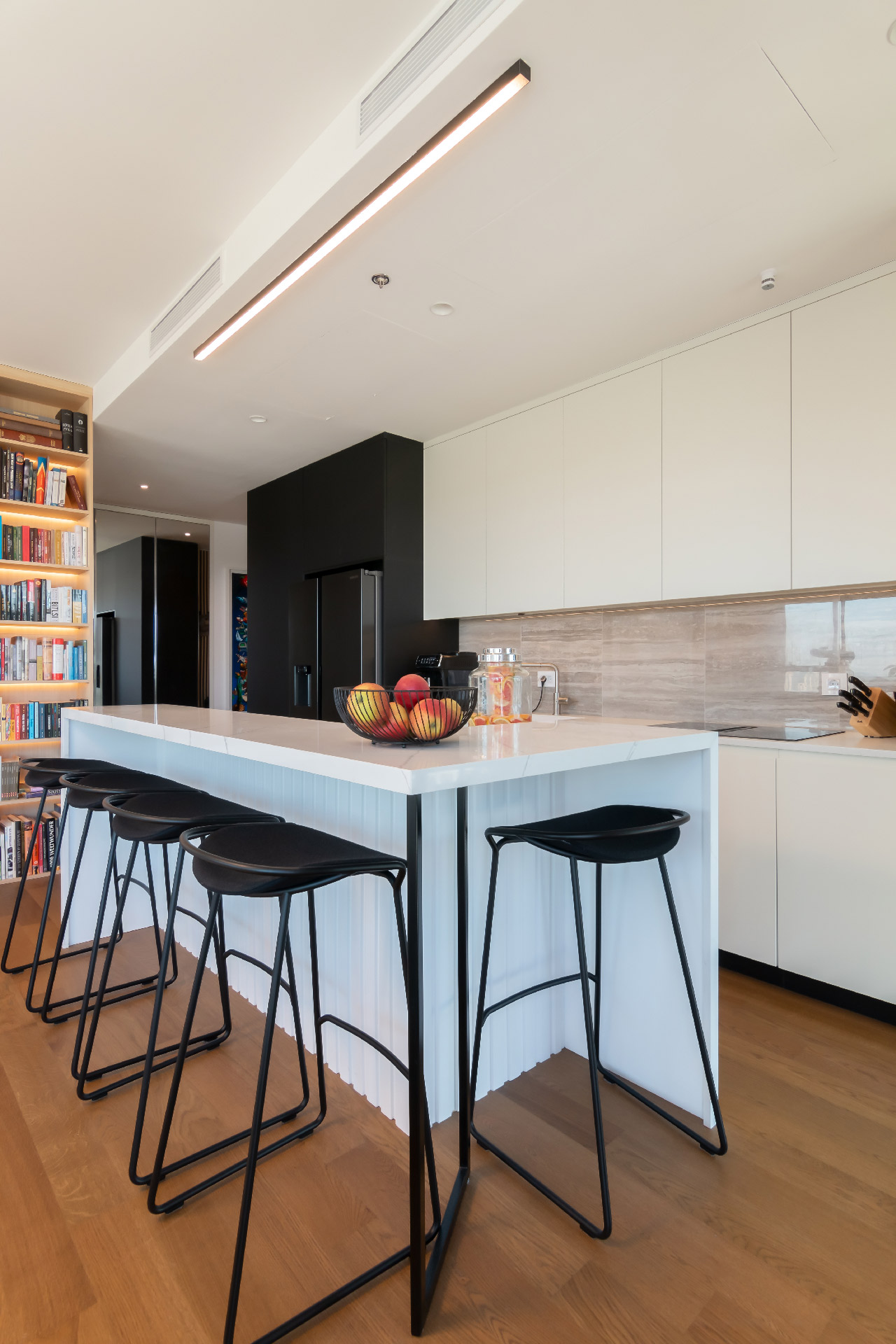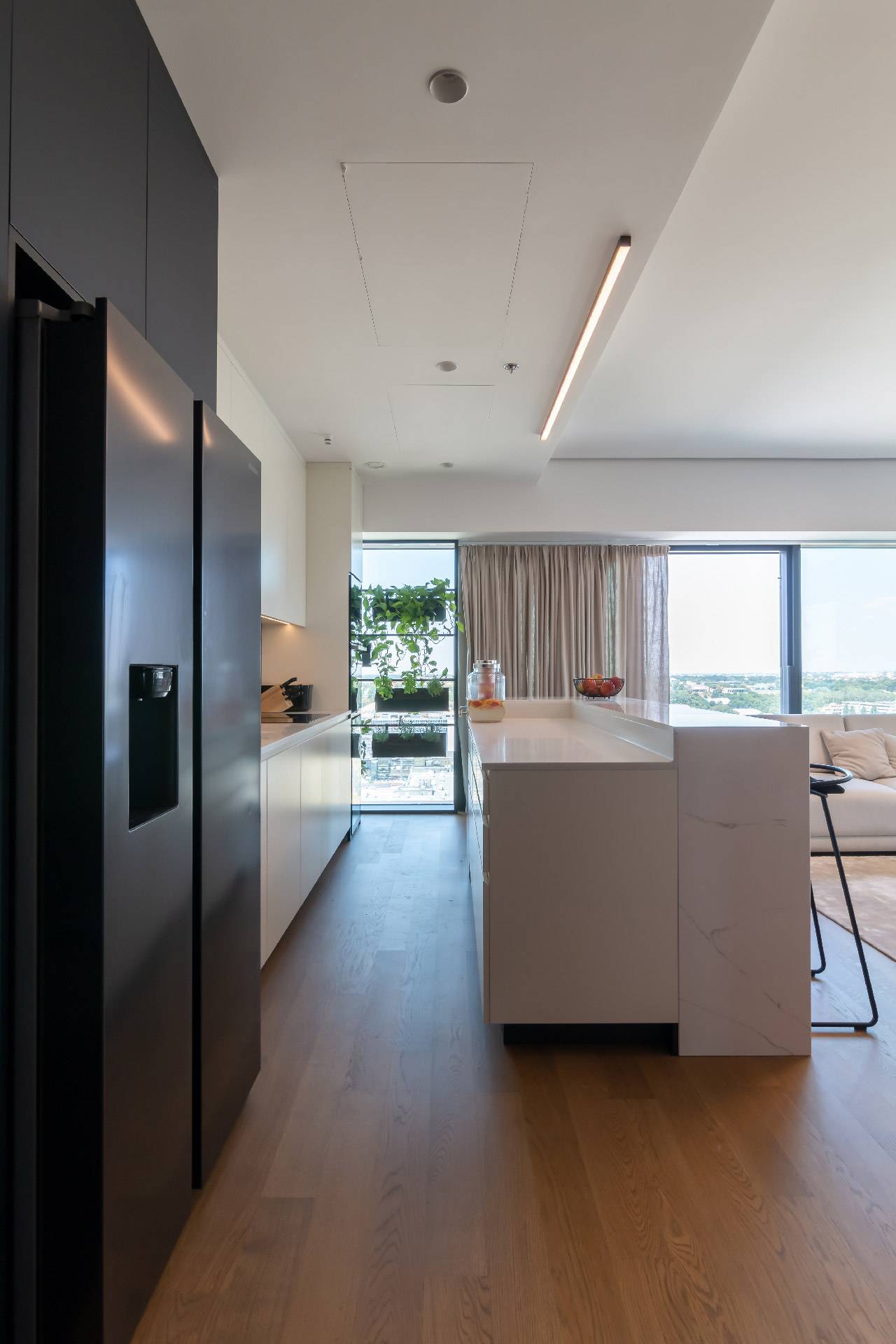 Kuhinja je napravljena po meri u kombinaciji belog MDF-a i crnog antifinger univera. Radna ploča izvedena od Kerrocka, a na šank je stavljen mermer.