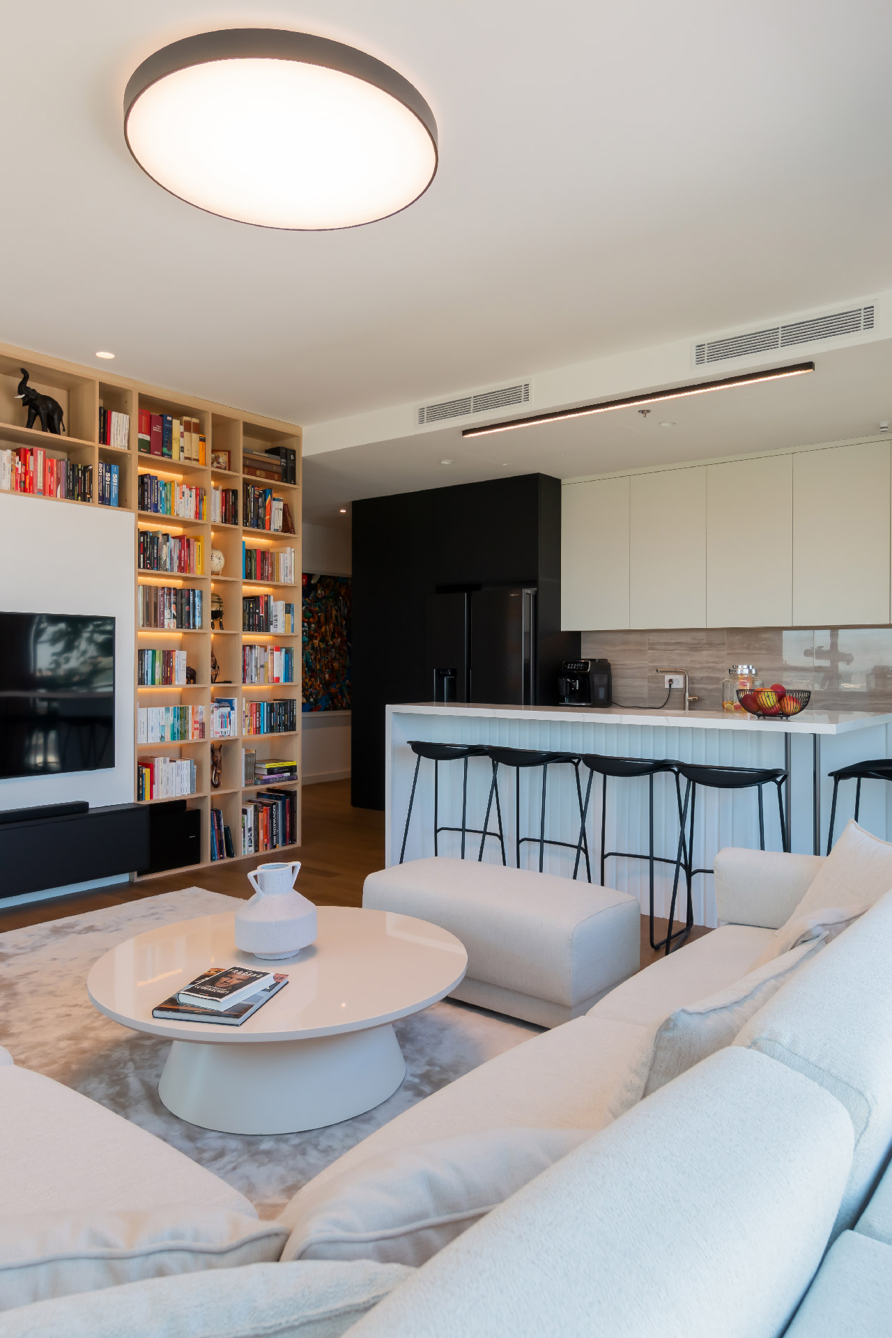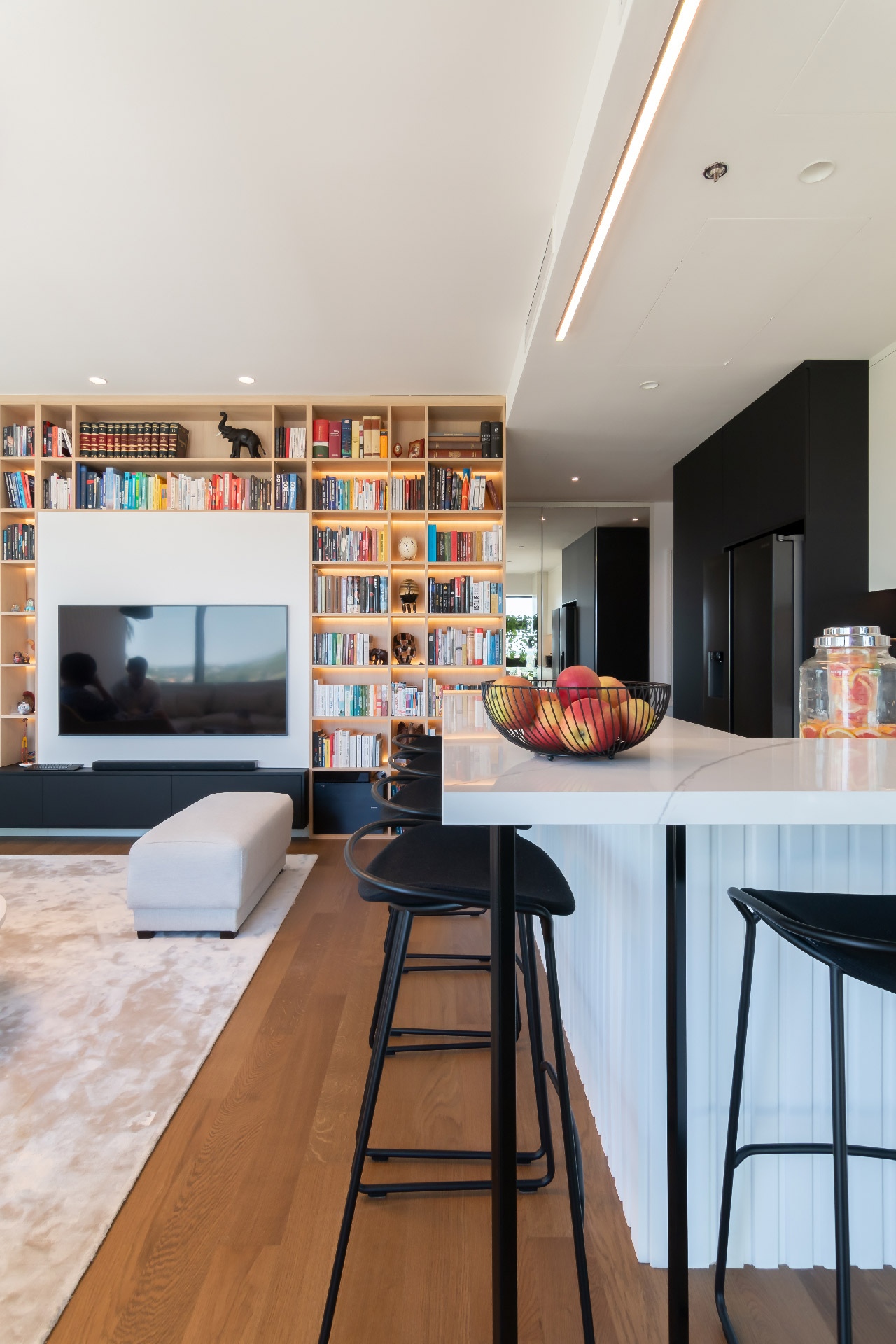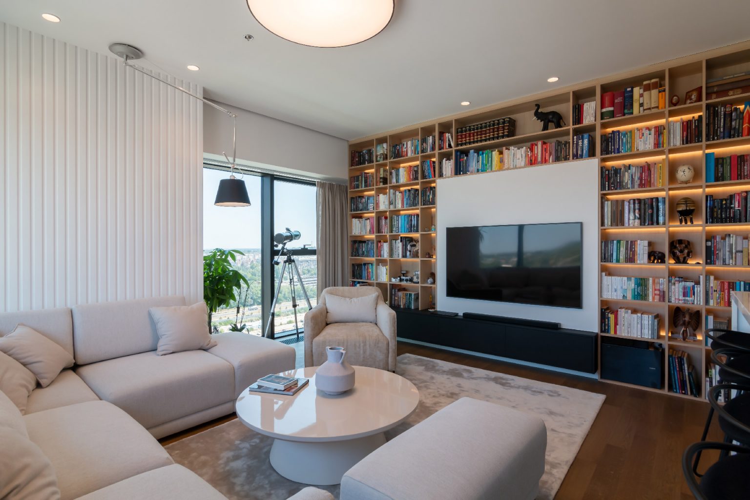 Vlasnik stana je veliki ljubitelj knjiga, te je na najveći zid dnevne sobe oko TV-a smeštena velika bibilioteka sa pozadinskim LED svetlom.