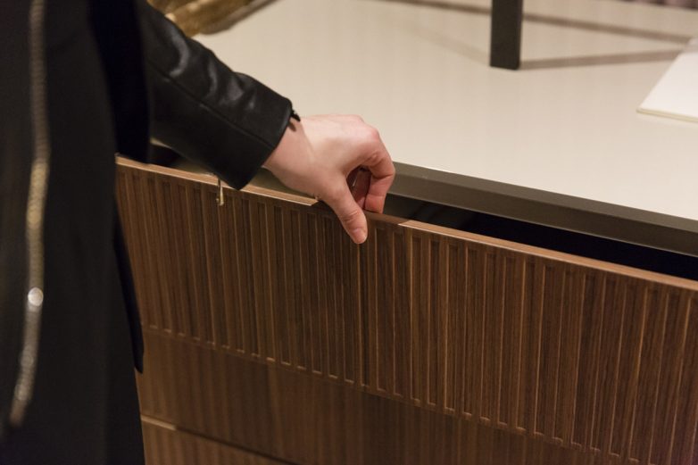 TV komoda se ističe pozadinskom rasvetom i upečatljivom teksturom furnira na velikoj površini zida. Otvorene police su izuzetno tankog profila, a u zatvorene elemente je takođe ugrađena LED traka. Otvaranje zatvorenih elemenata je sa push mehanizmima bez vidnih ručkica.