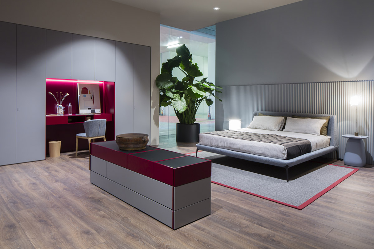 U uređenju spavaće sobe se ističe orman s ravnim frontovima u neutralnim nijansama koje se nastavljaju na zanimljive otvorene elemente niša sa radnim stolom, stolom za šminku, klupom ili prostorom za ogledalo. U ovim nišama, koje svojom jarkom bojom seku nenametljiv front ormana, ugrađeno je i dodatno svetlo.