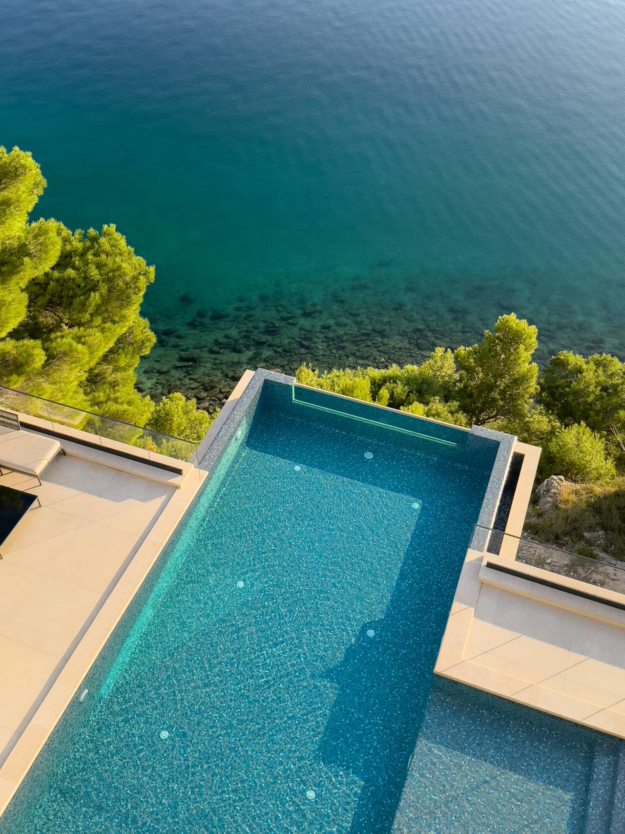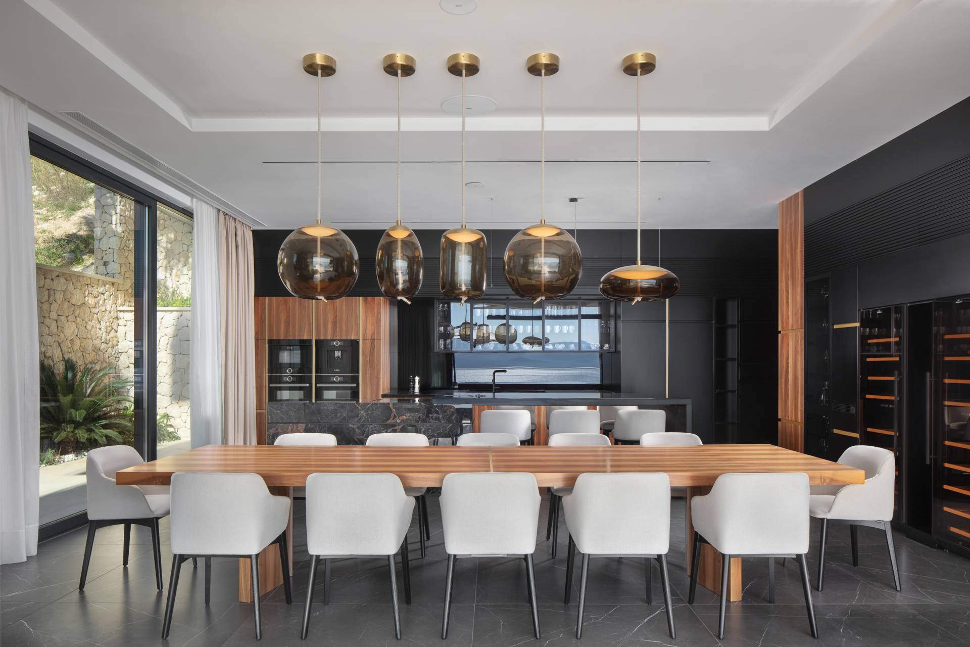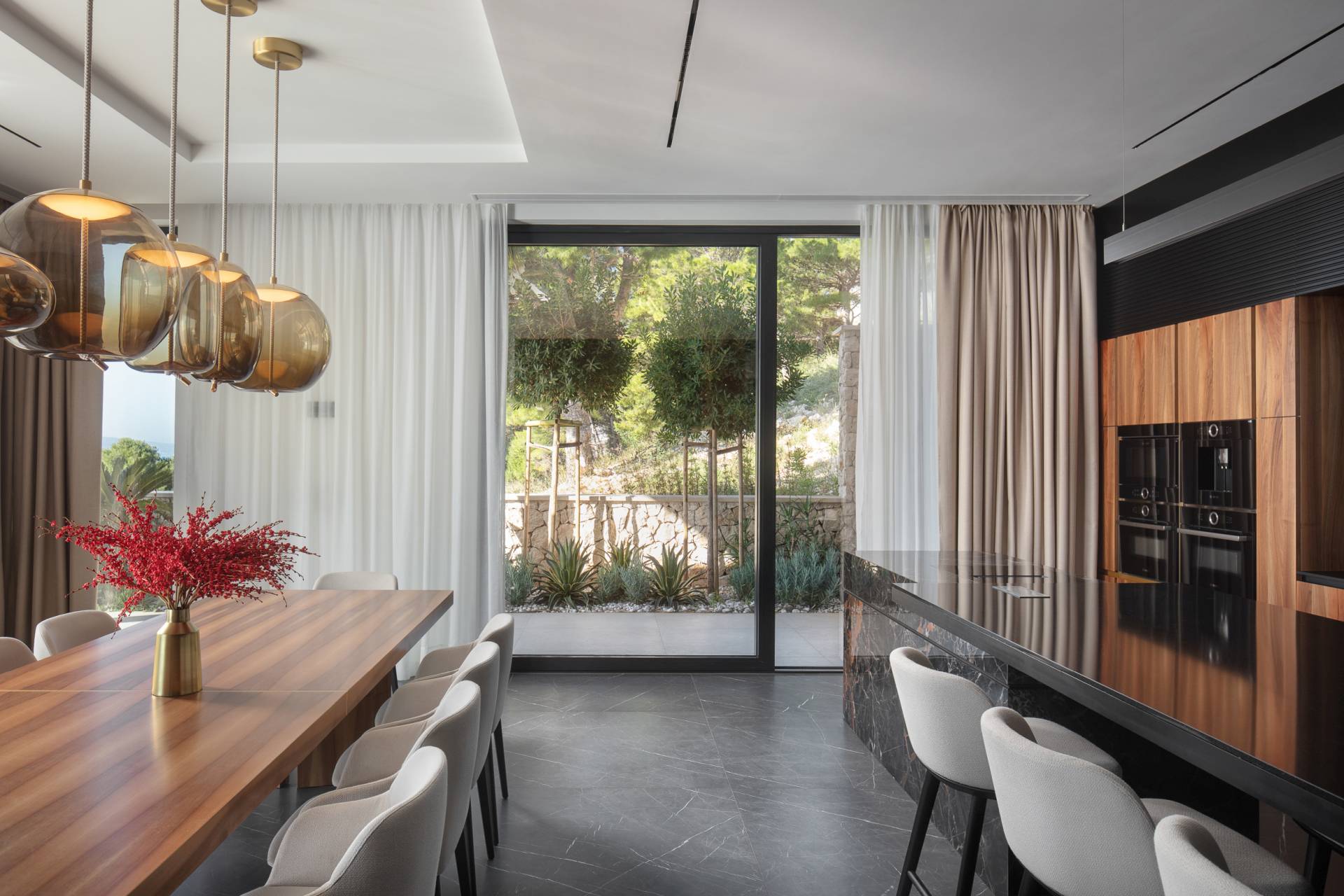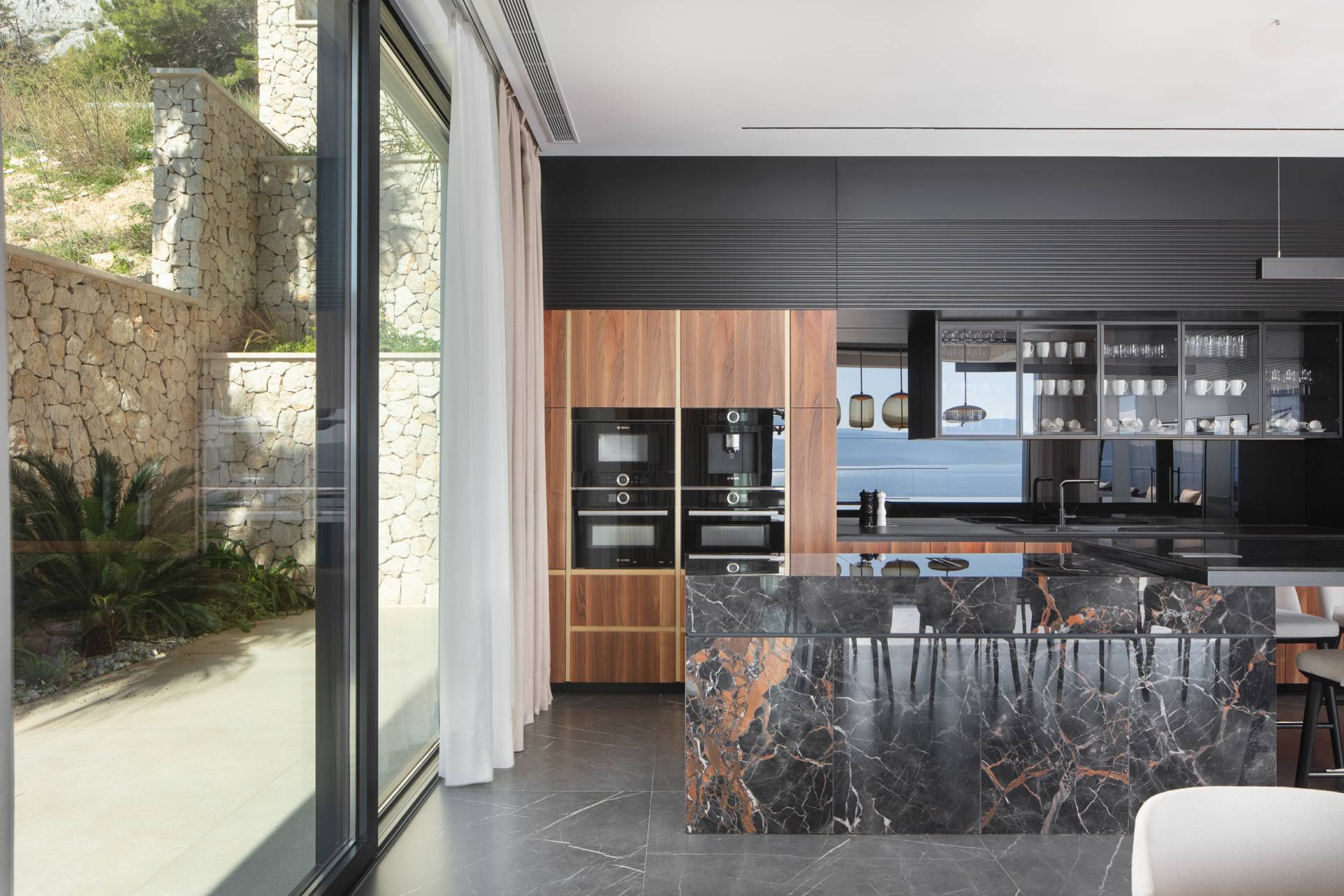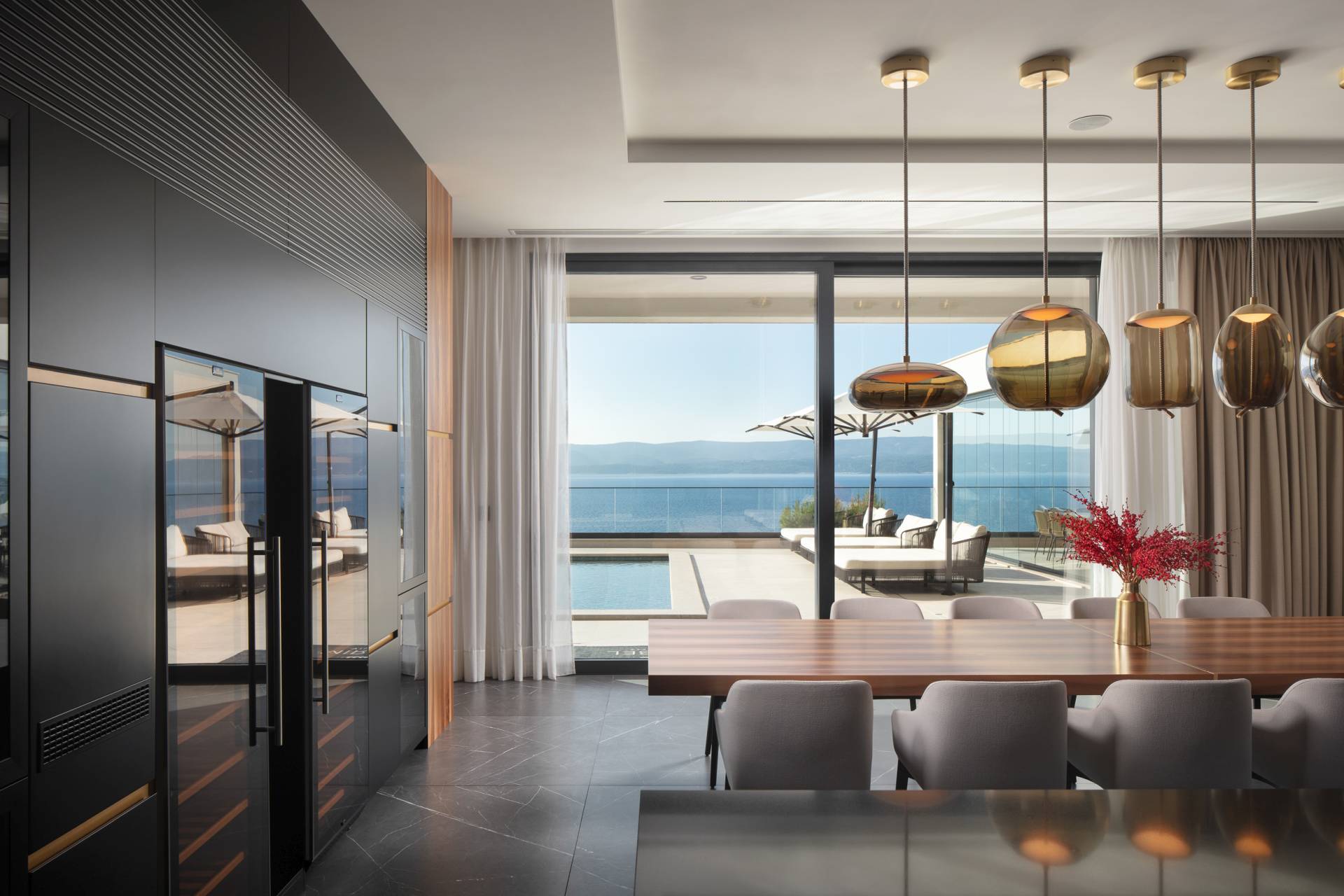 Velike staklene površine otvaraju ove zone prema terasi i “infinity” bazenu, čime se briše granica između enterijera i eksterijera.