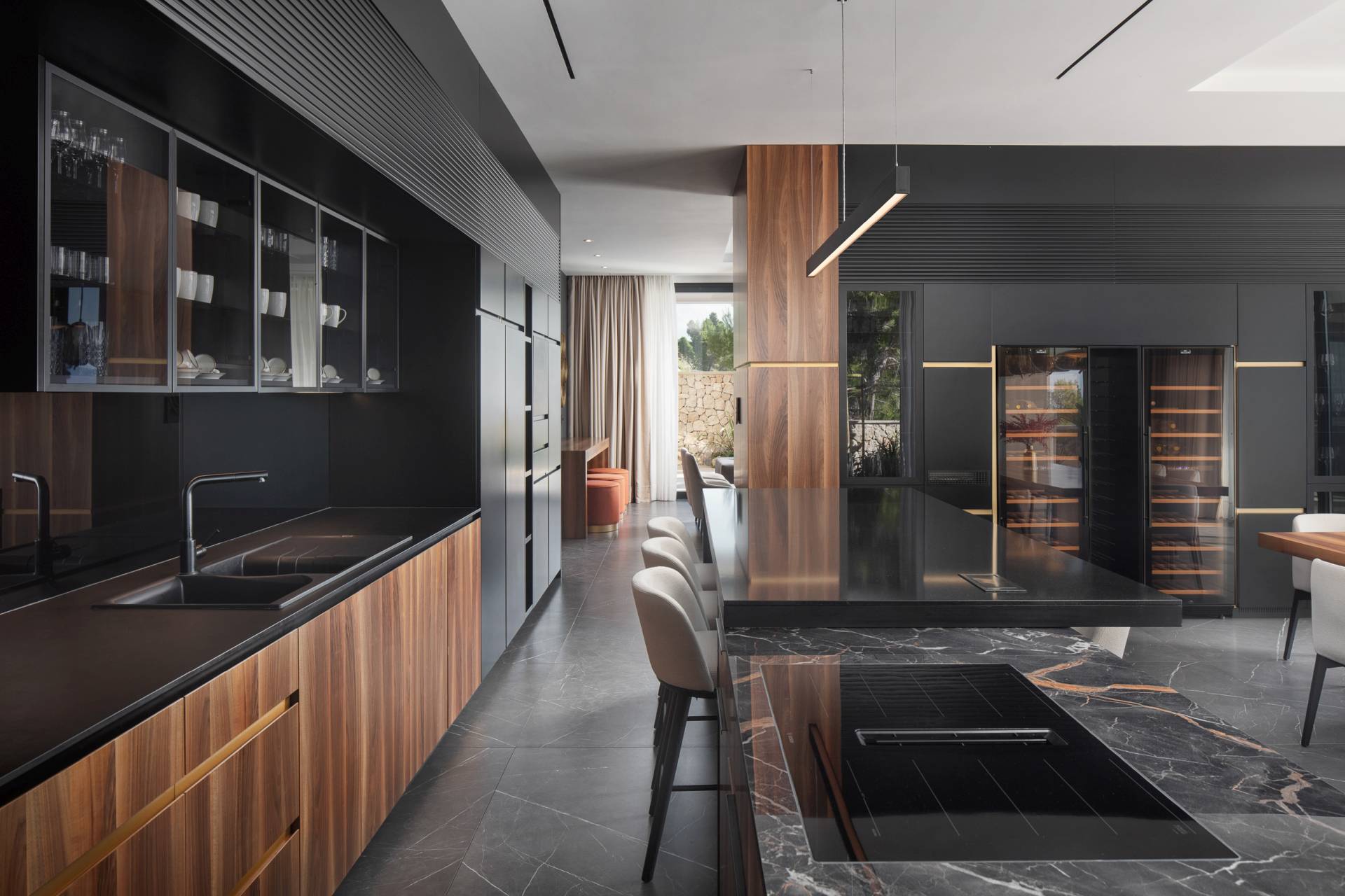 U enterijeru dominiraju upečatljivi materijali, kontrasti i teksture koje prostoru daju dodatnu dubinu i prepoznatljivost.
