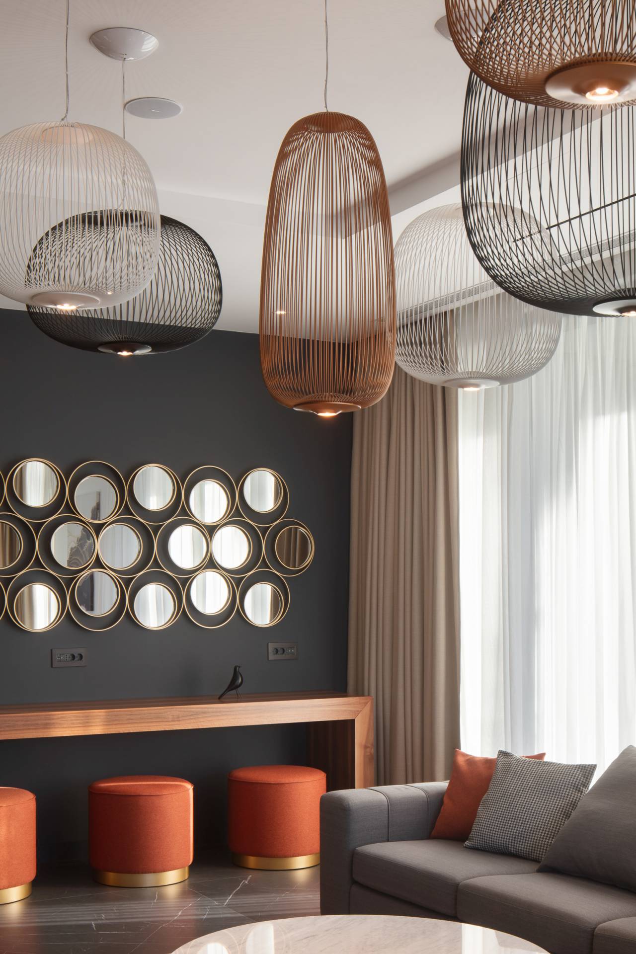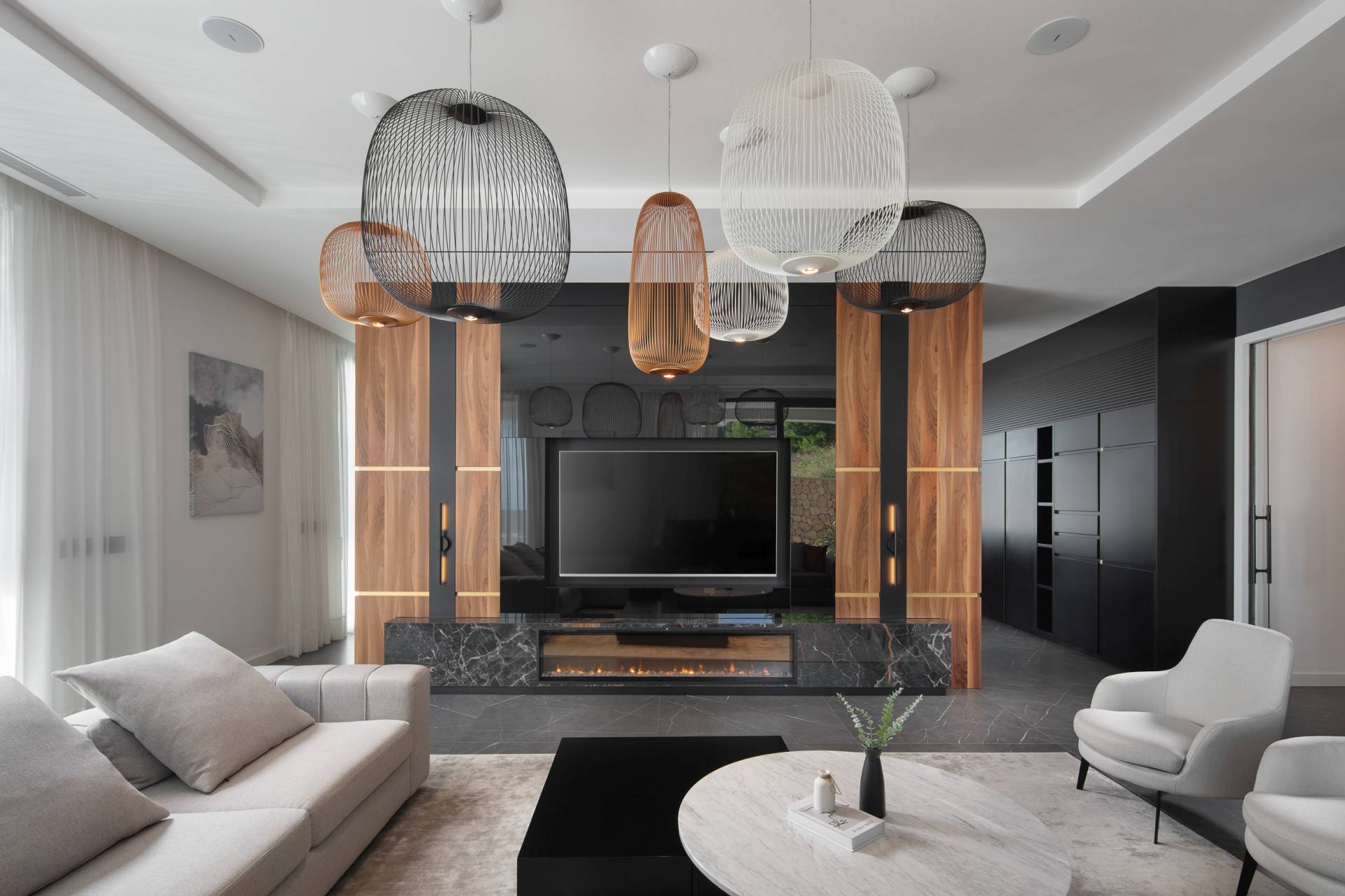 Posebno se izdvajaju pažljivo odabrani rasvetni akcenti. U trpezariji se nalaze dizajnerske lampe, dok kompozicija lampi u dnevnom boravku dodatno naglašava reprezentativnost centralne zone vile.