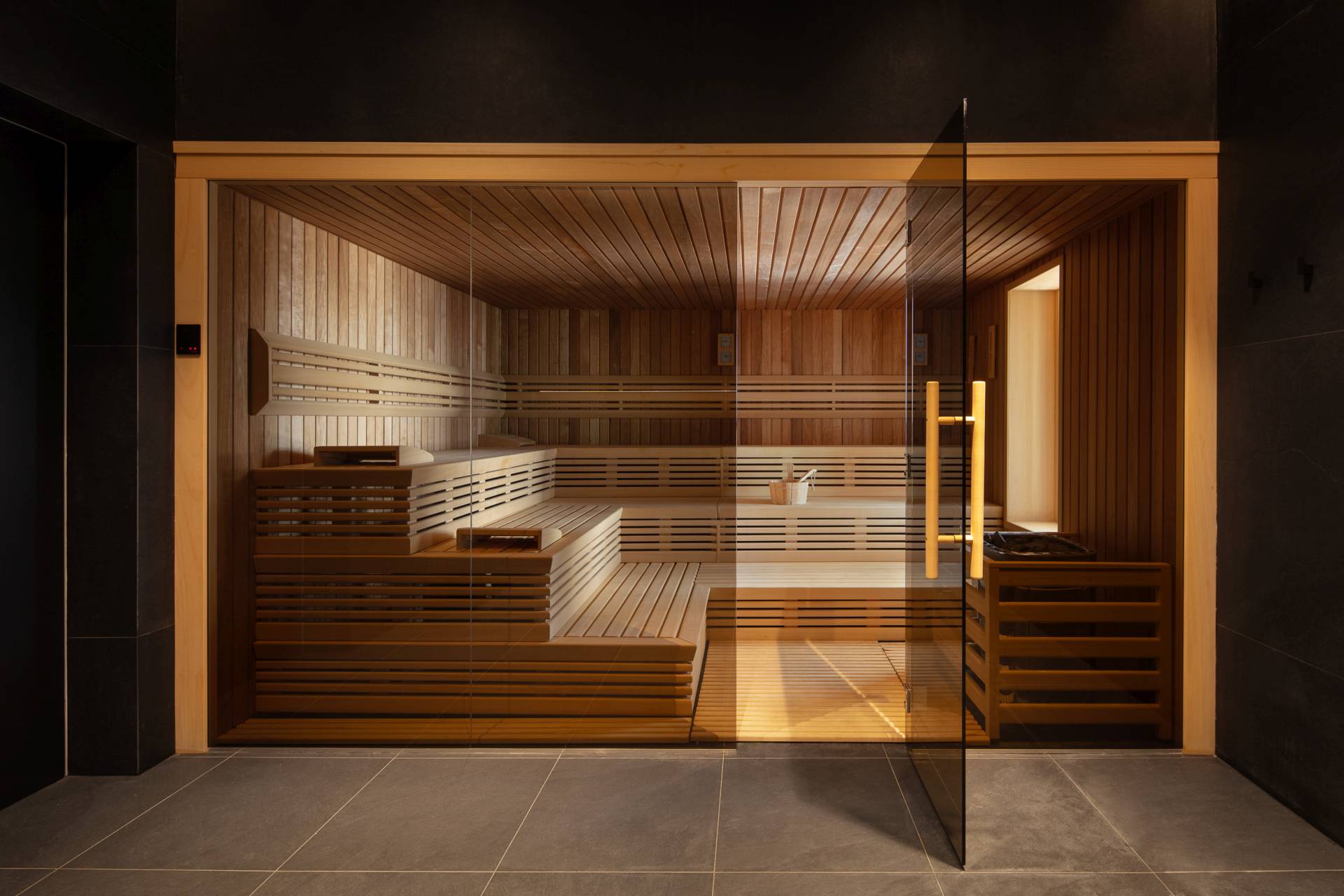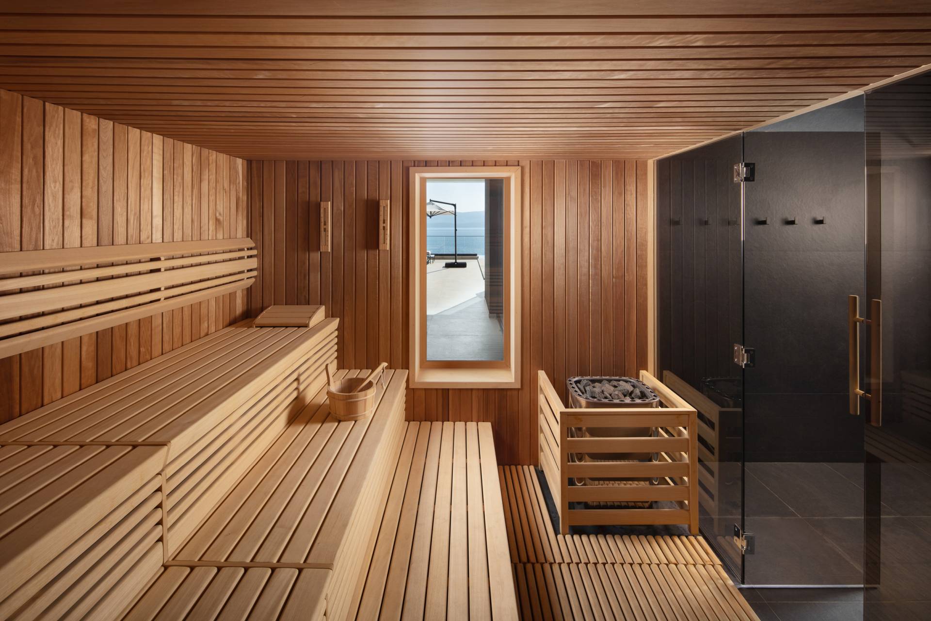 Poseban utisak ostavlja i “jumbo” sauna od 12 kvadrata, koja ima otvoren pogled na more i sunčalište. Teretana je opremljena dizajnerskom opremom i takođe je orijentisana ka moru, pa i prostori namenjeni relaksaciji i vežbanju zadržavaju snažnu vezu sa pejzažom.