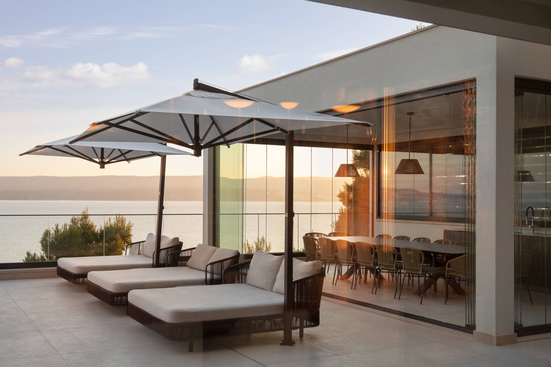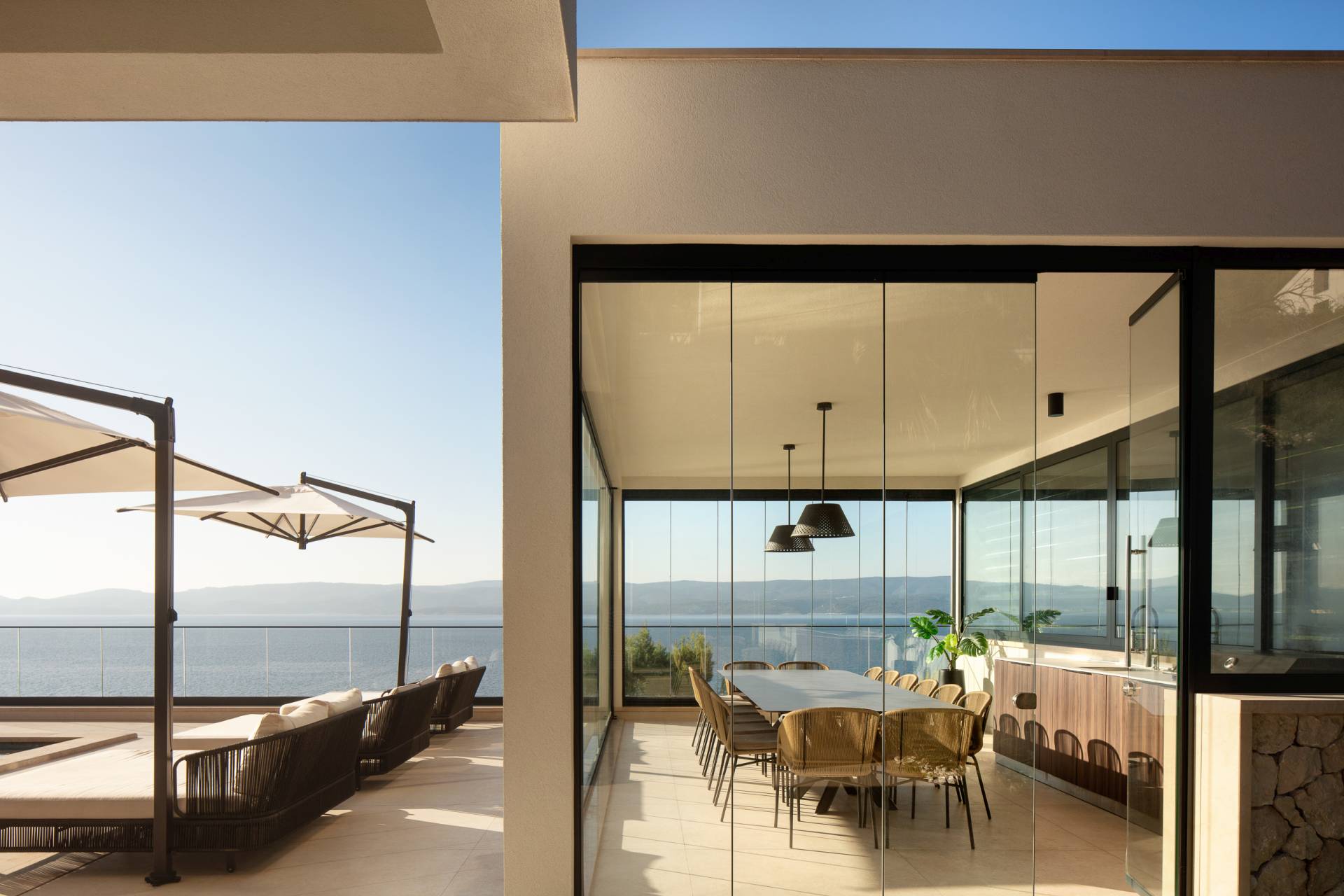 Terase raspoređene na više etaža otvaraju se prema beskrajnom horizontu i omogućavaju neometane vizure ka moru i ostrvima.