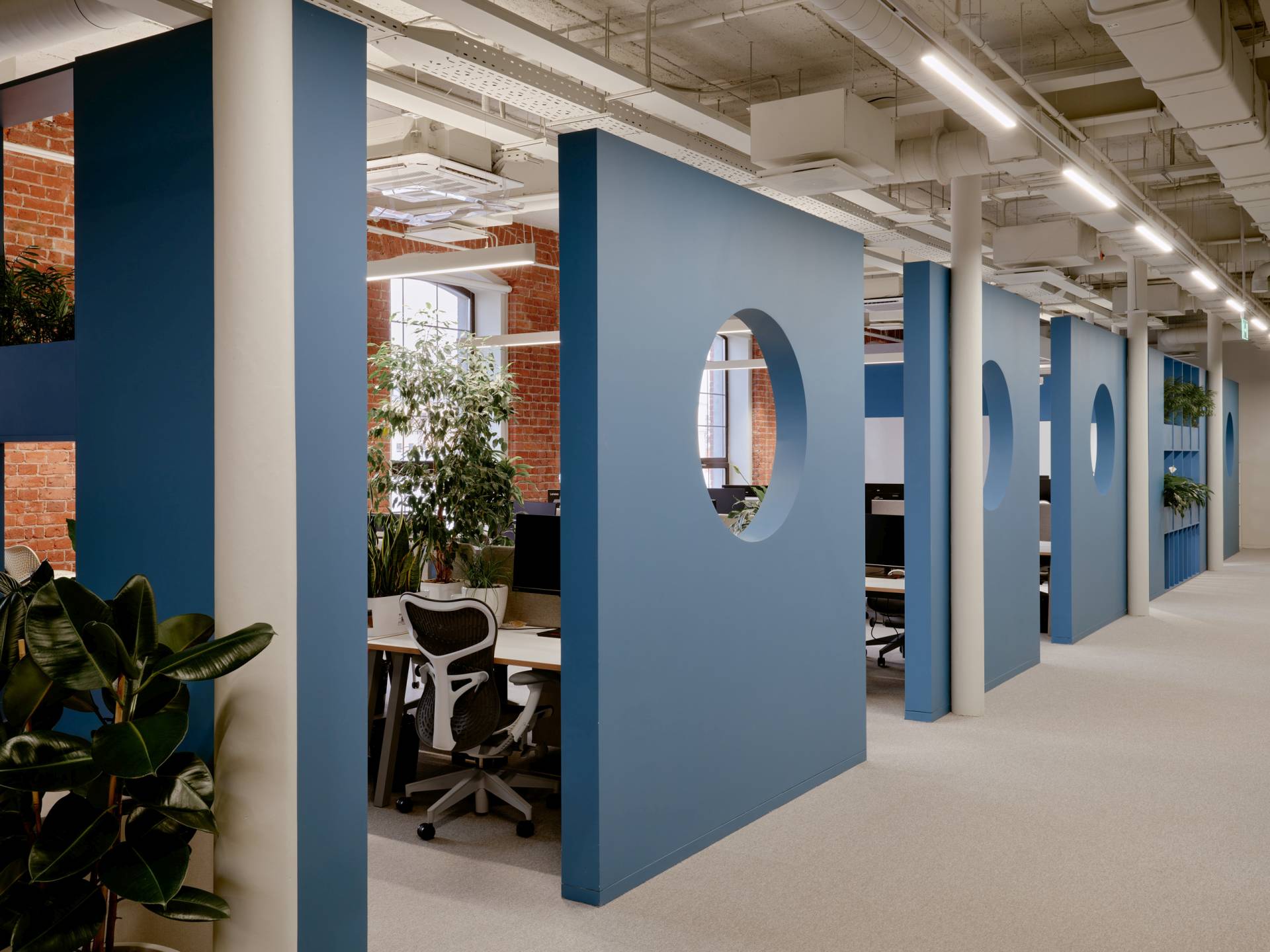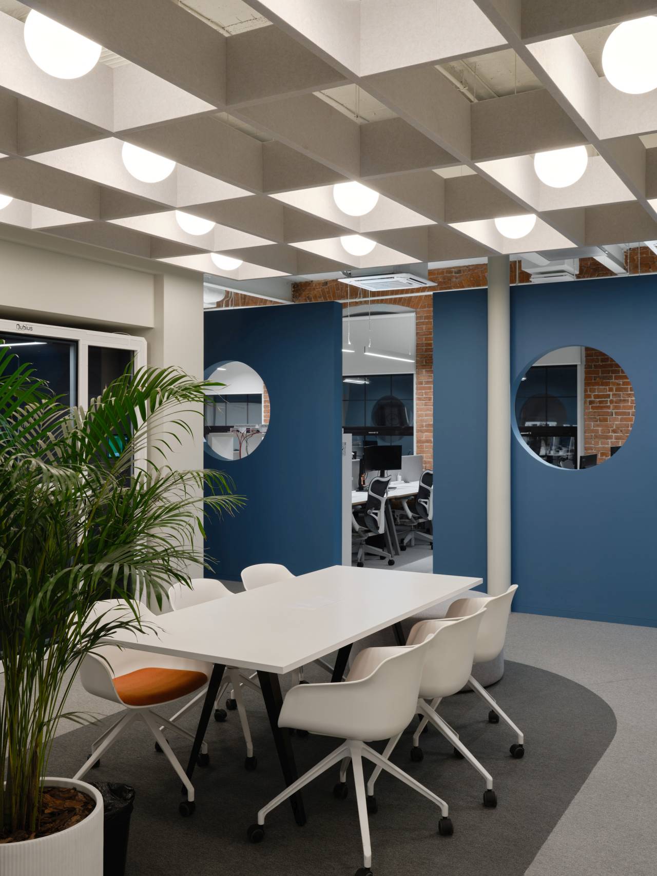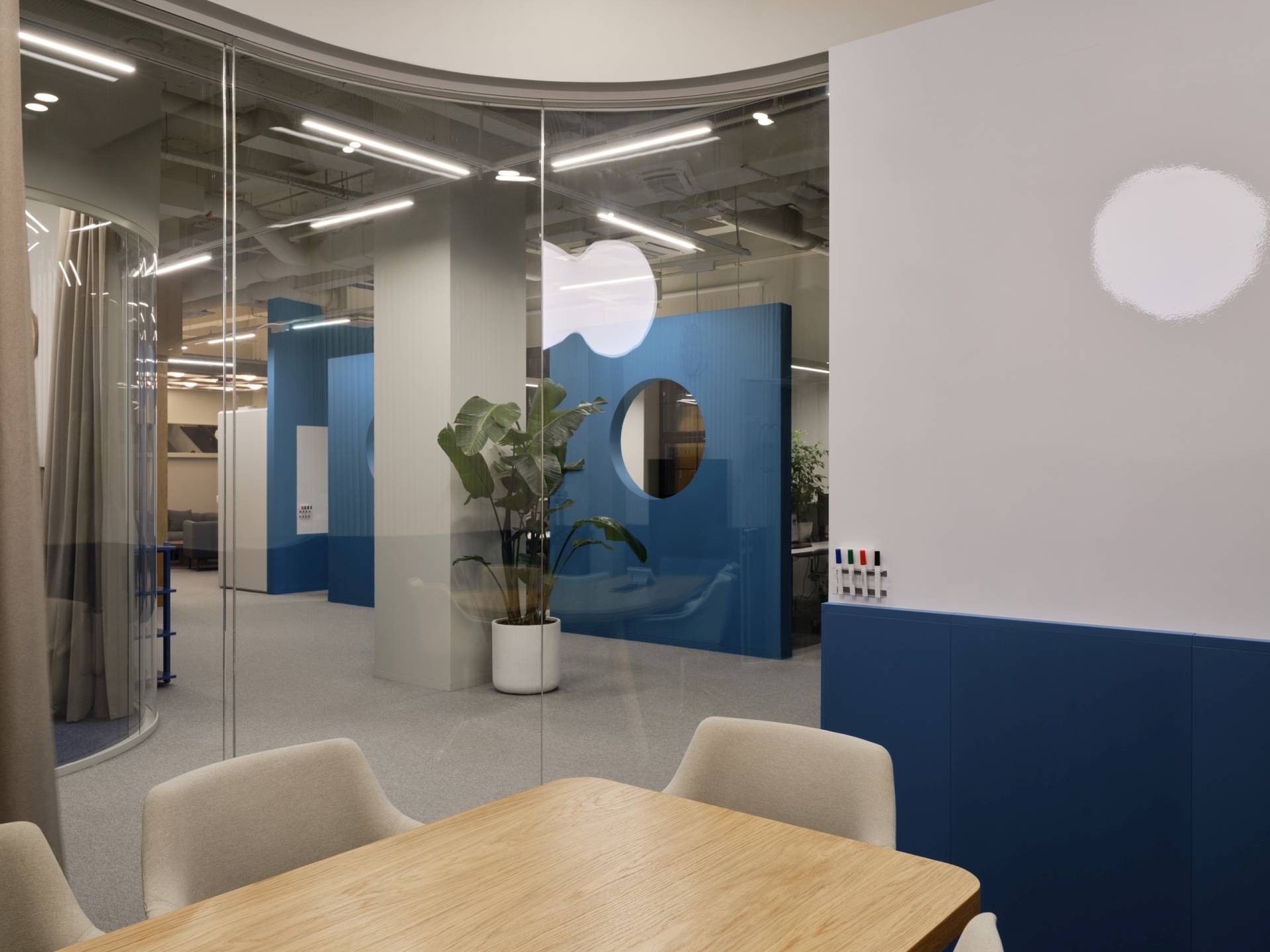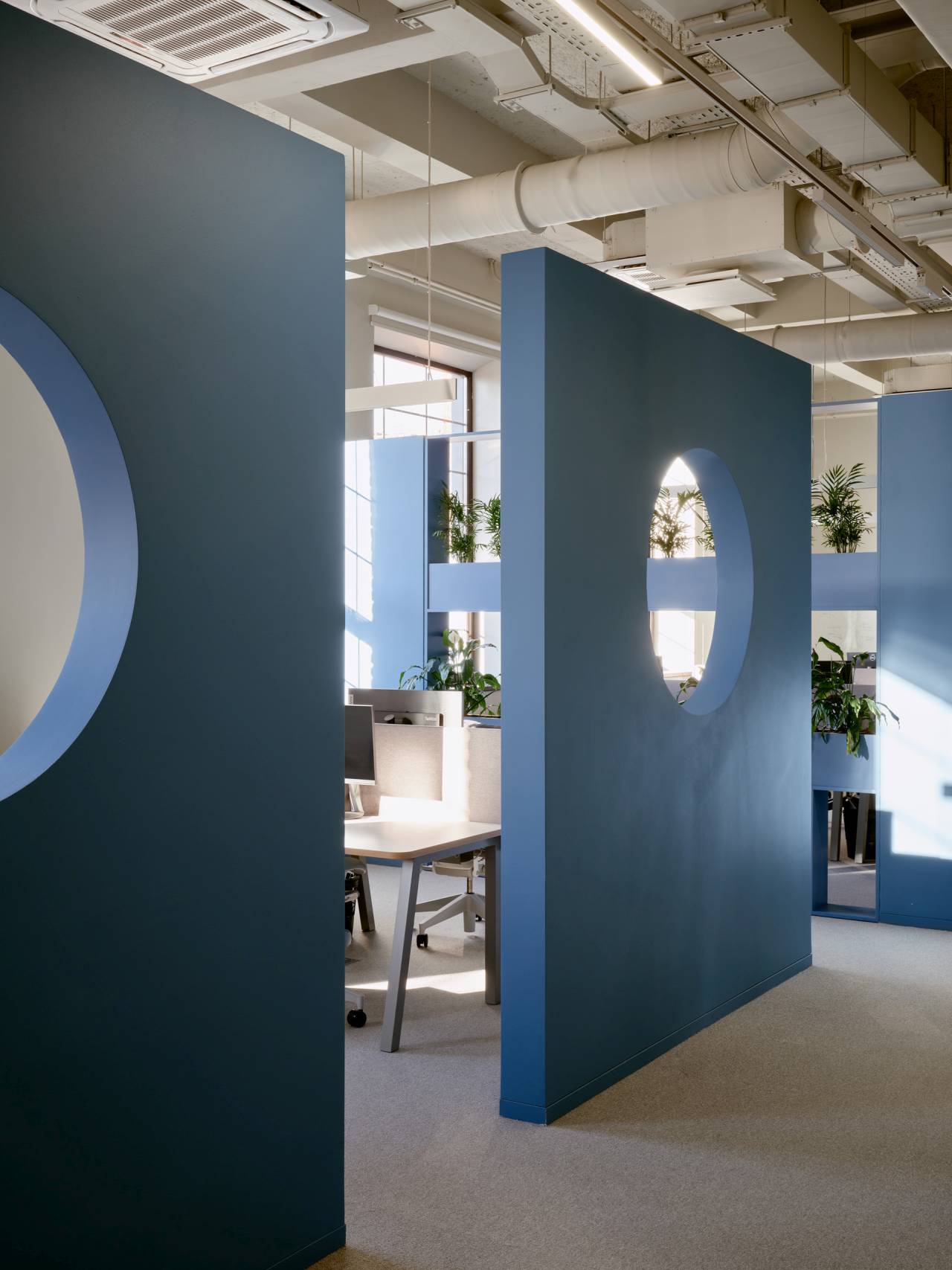 Glavni vizuelni akcenat enterijera čine geometrijske pregrade u plavoj boji, sa kružnim otvorima.