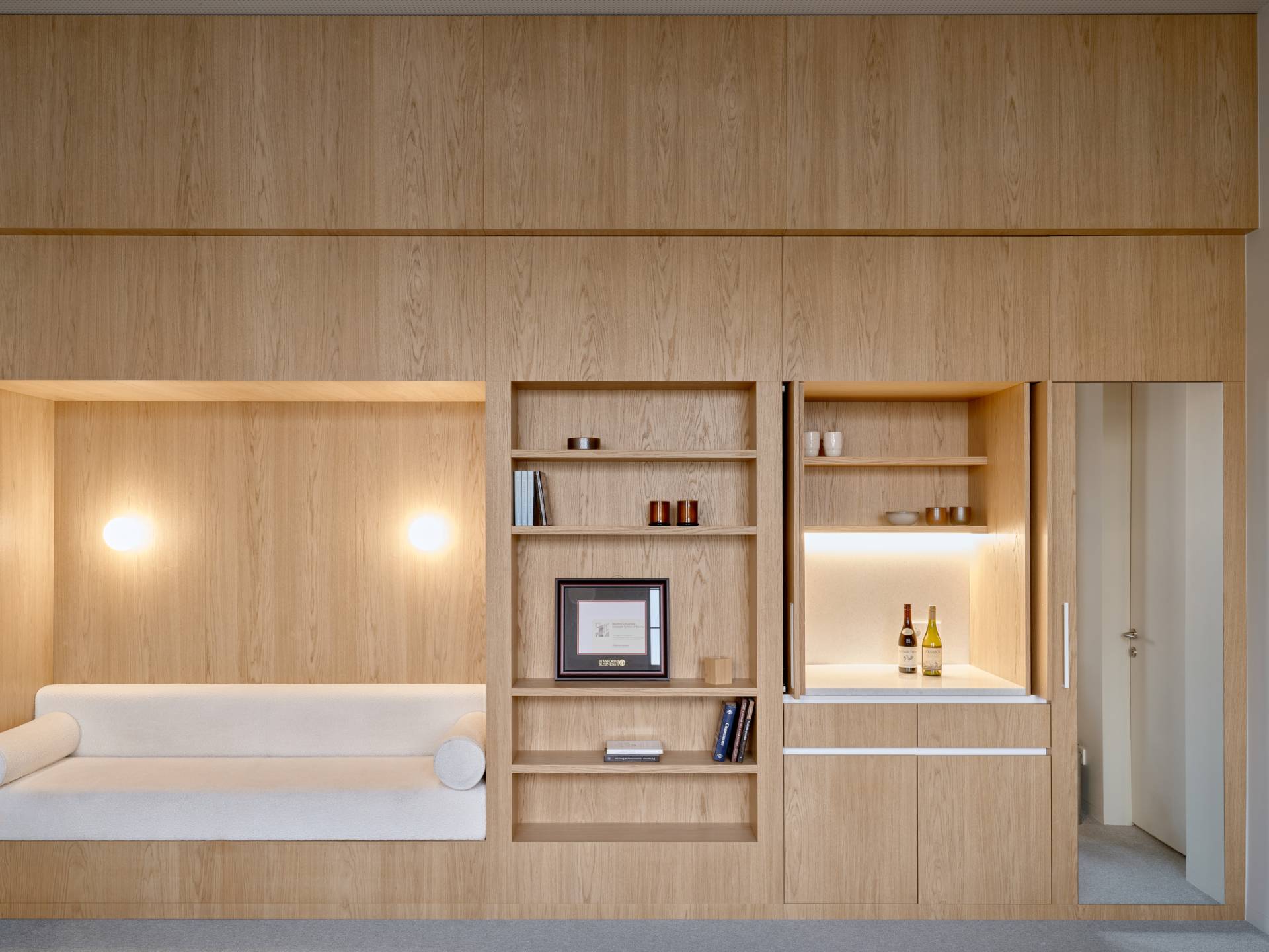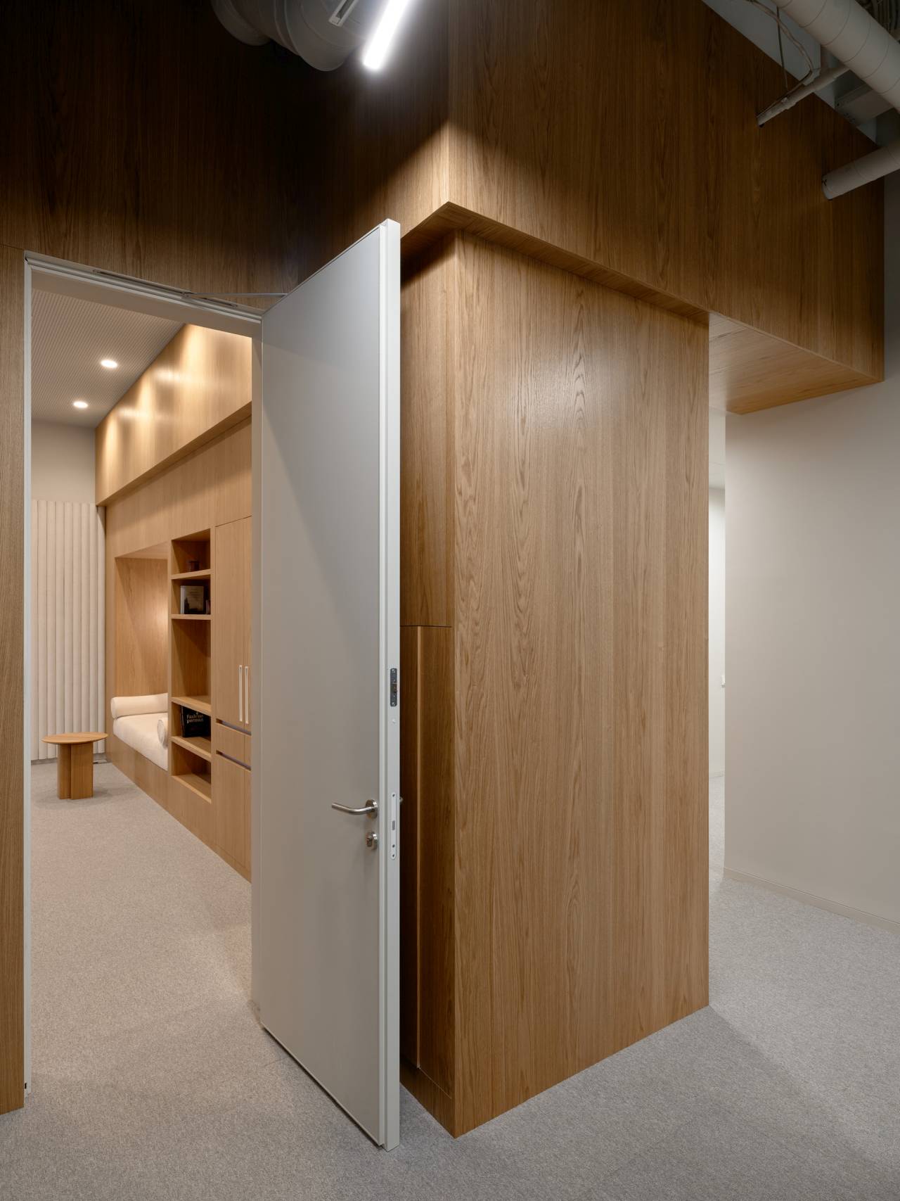 Istovremeno, enterijer je omekšan čistim linijama, tekstilnim oblogama poda, toplim drvenim zidnim oblogama i nameštajem, kao i zakrivljenim staklenim površinama koje ublažavaju strogoću konstrukcije i podstiču osećaj protočnosti kroz prostor.