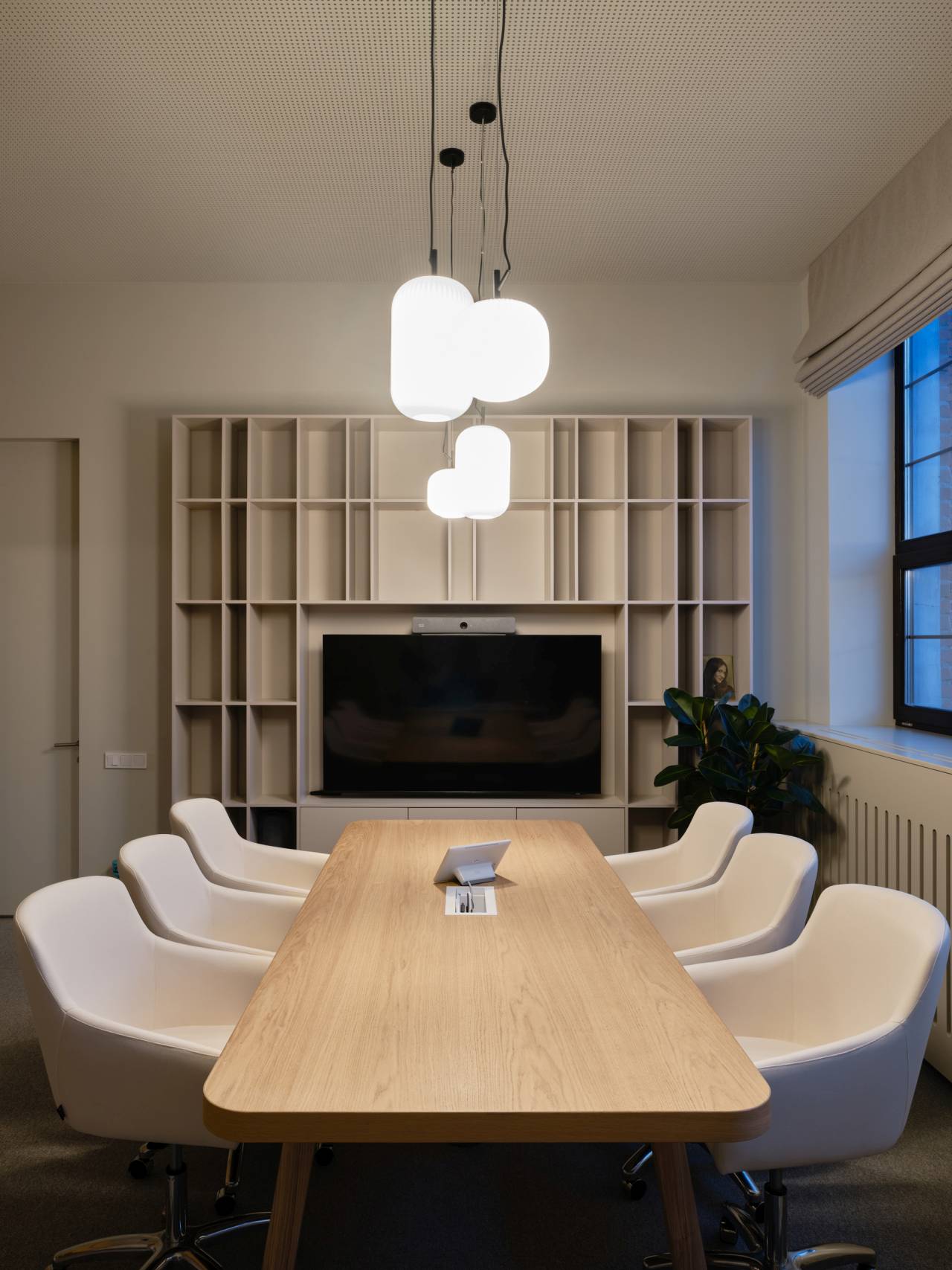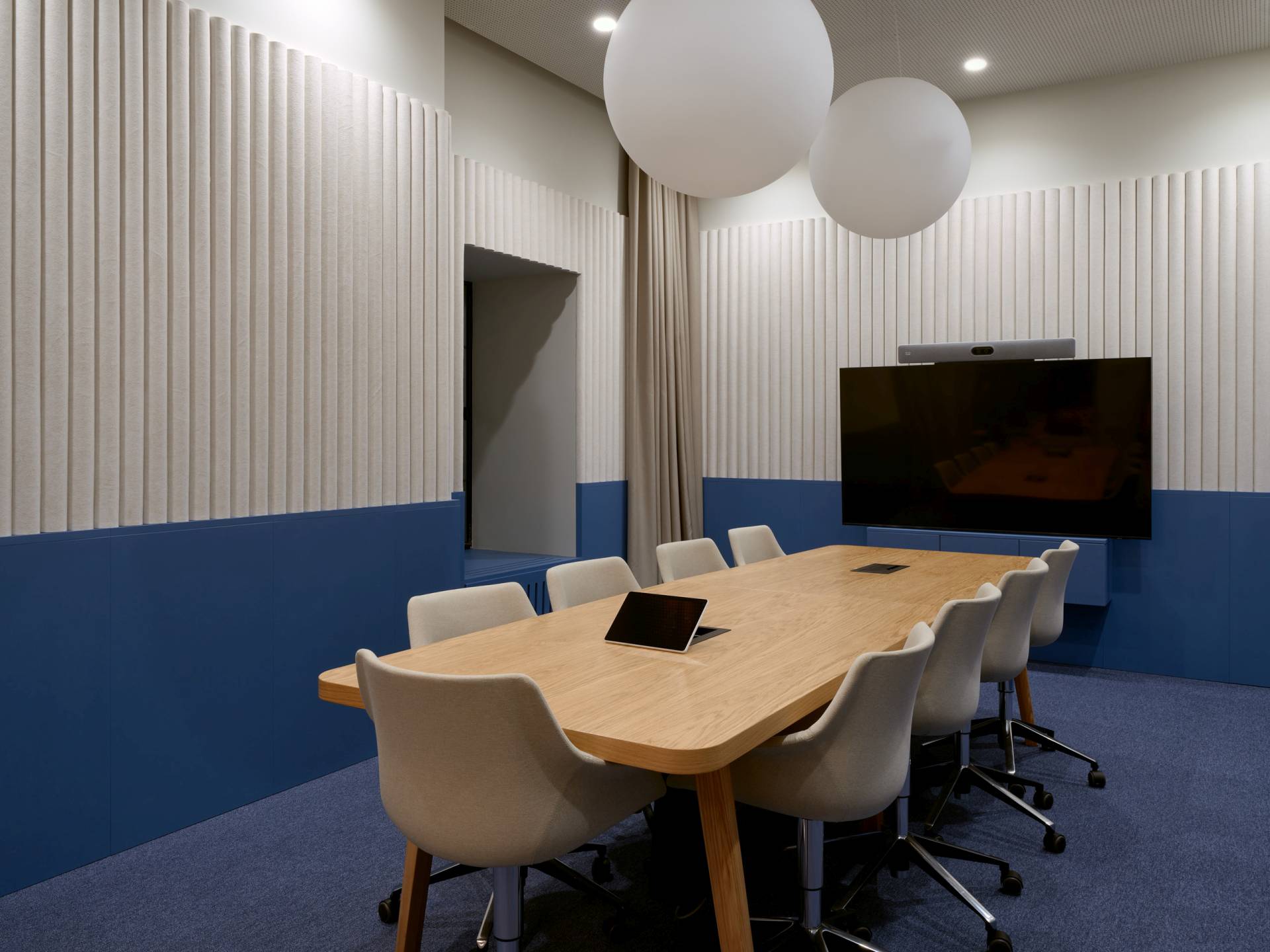 Staklene sale za sastanke naglašavaju transparentnost i kulturu otvorenosti, a zavese unutar prostorija omogućavaju fleksibilnost i privatnost kada je potrebna.