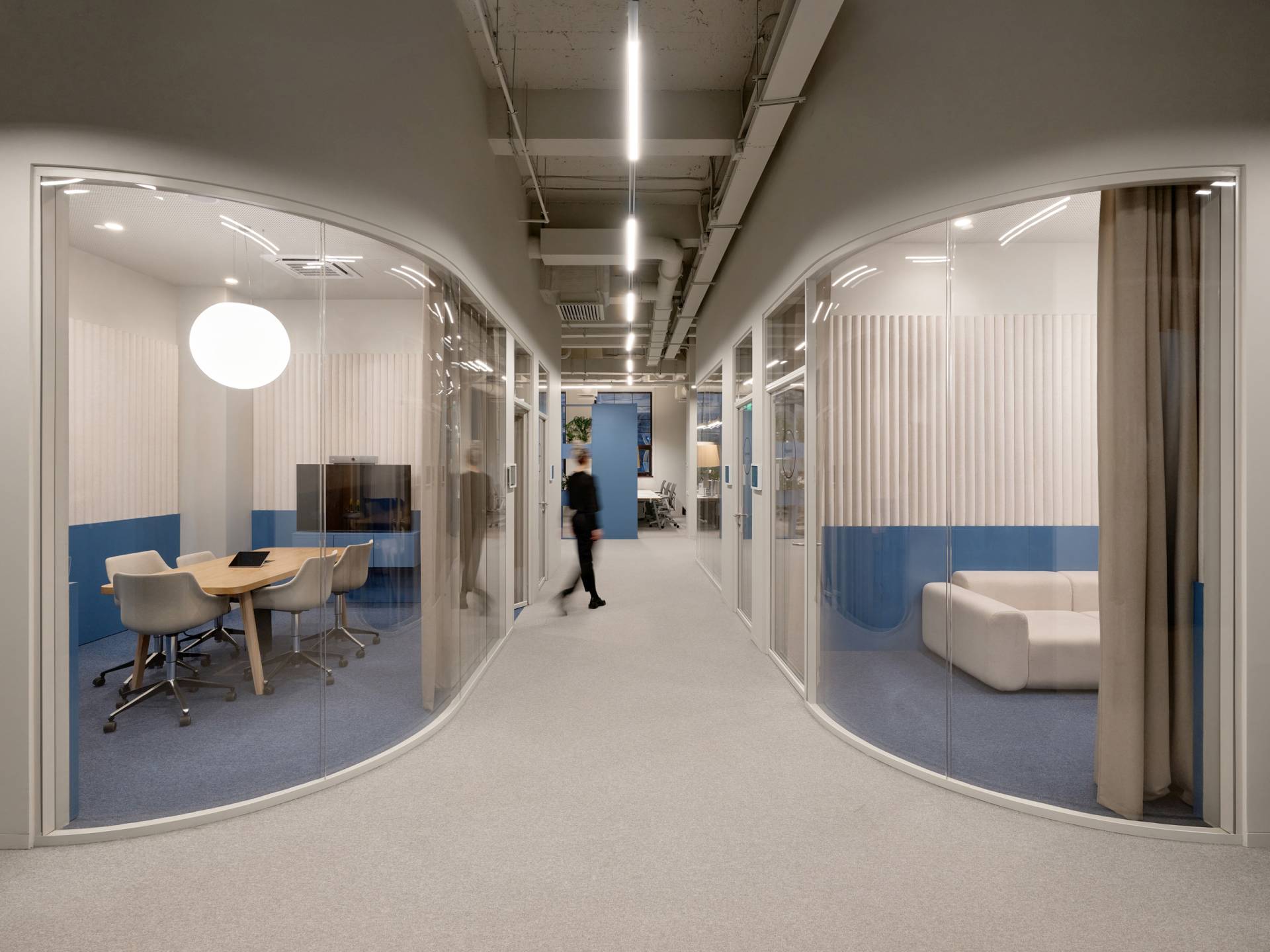 Staklene sale za sastanke naglašavaju kulturu otvorenosti, a zavese omogućavaju privatnost kada je potrebna.