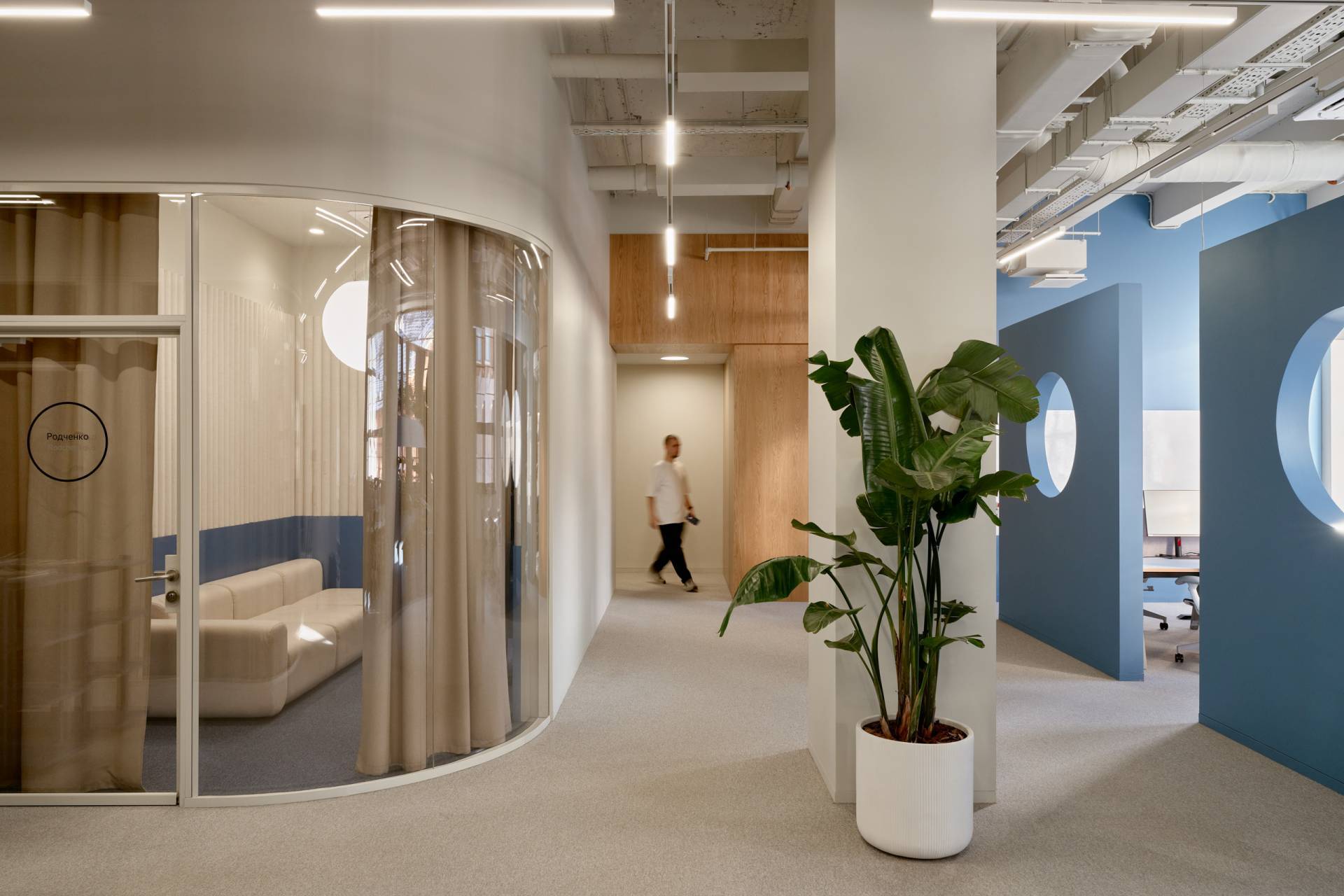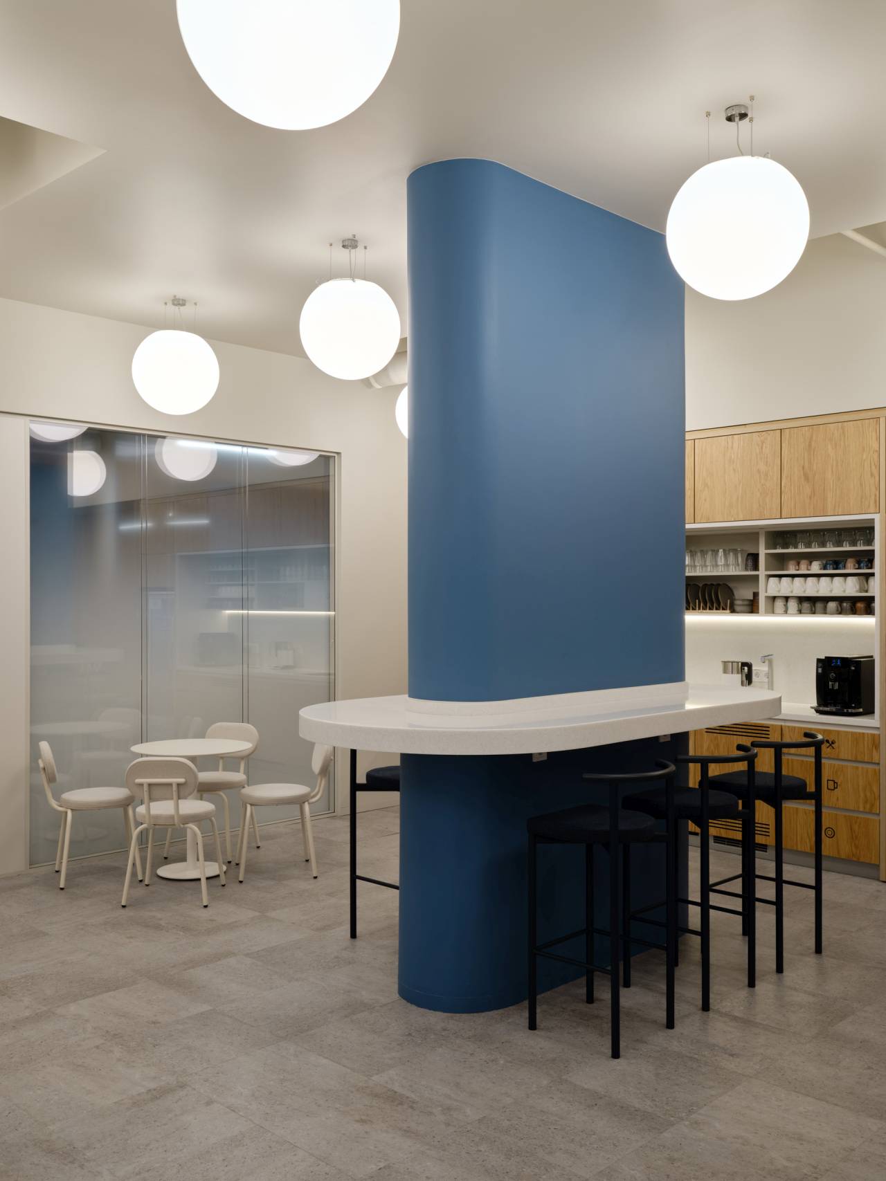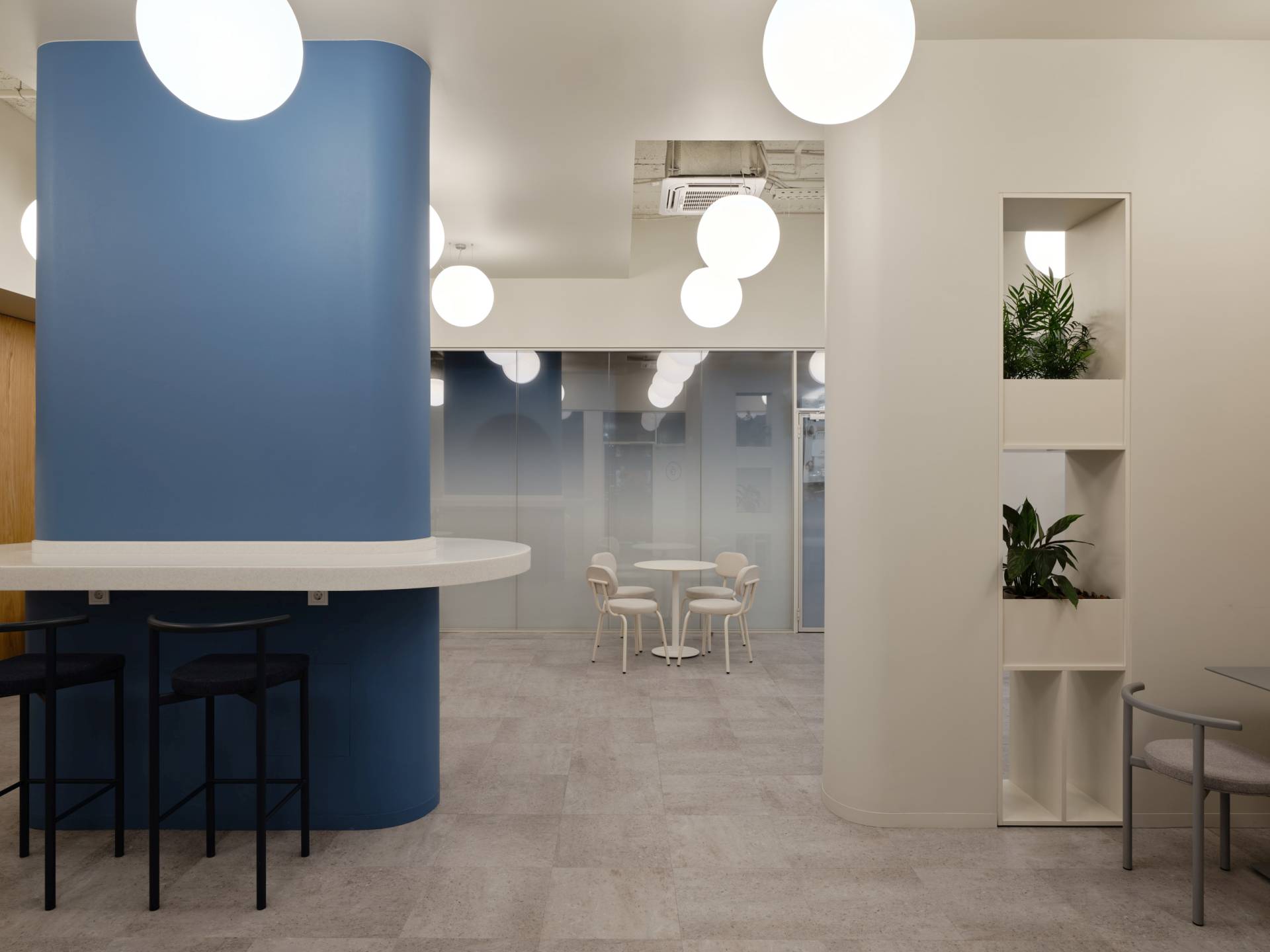 Glavni vizuelni akcenat enterijera čine geometrijske pregrade u nežnoj plavoj boji, sa kružnim otvorima.
