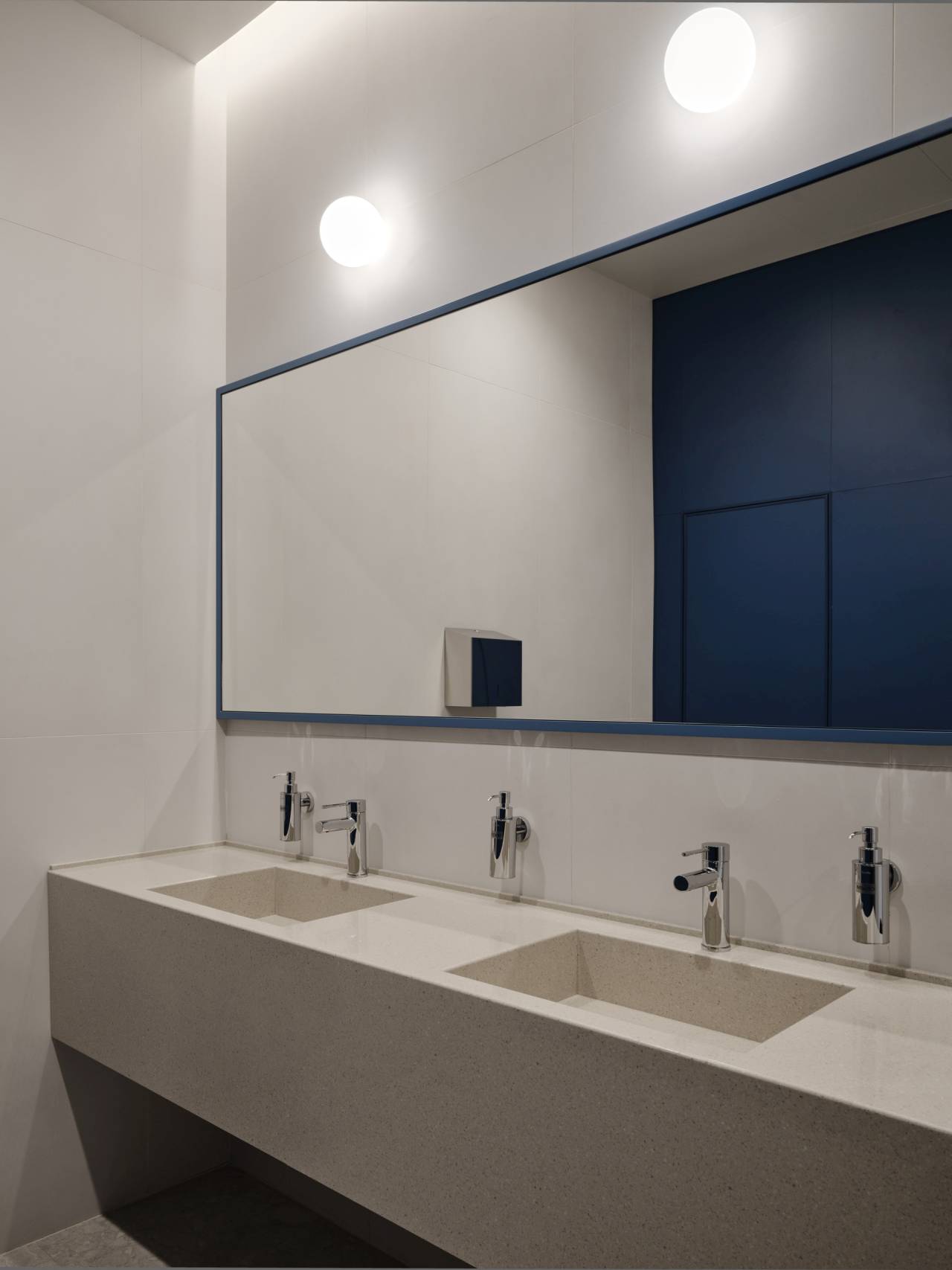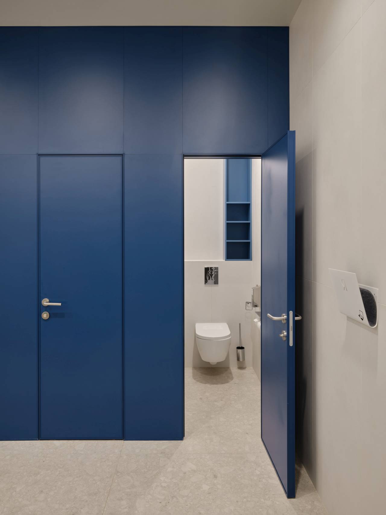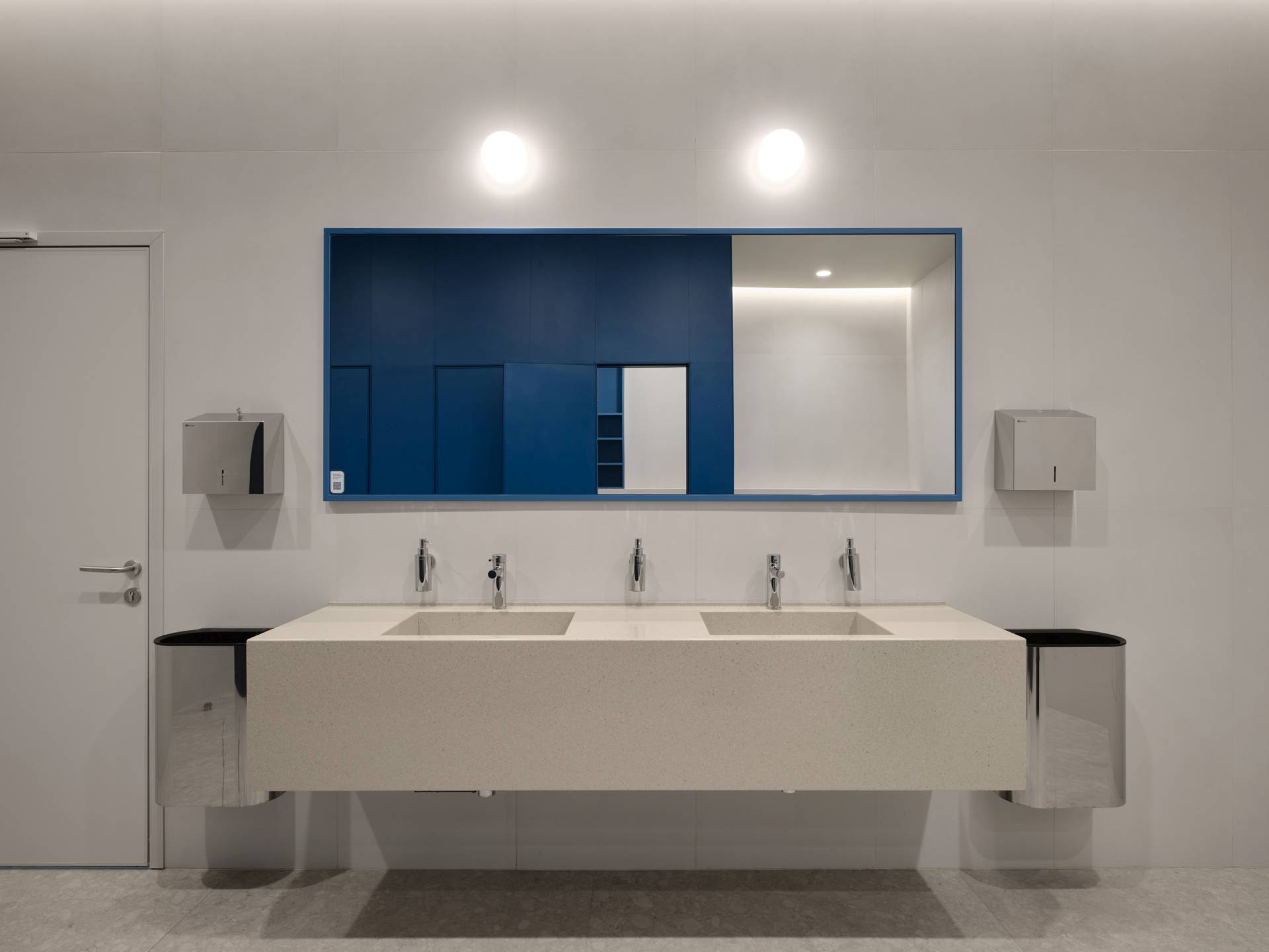 Glavni vizuelni akcenat enterijera čine geometrijske pregrade u nežnoj plavoj boji, sa kružnim otvorima.