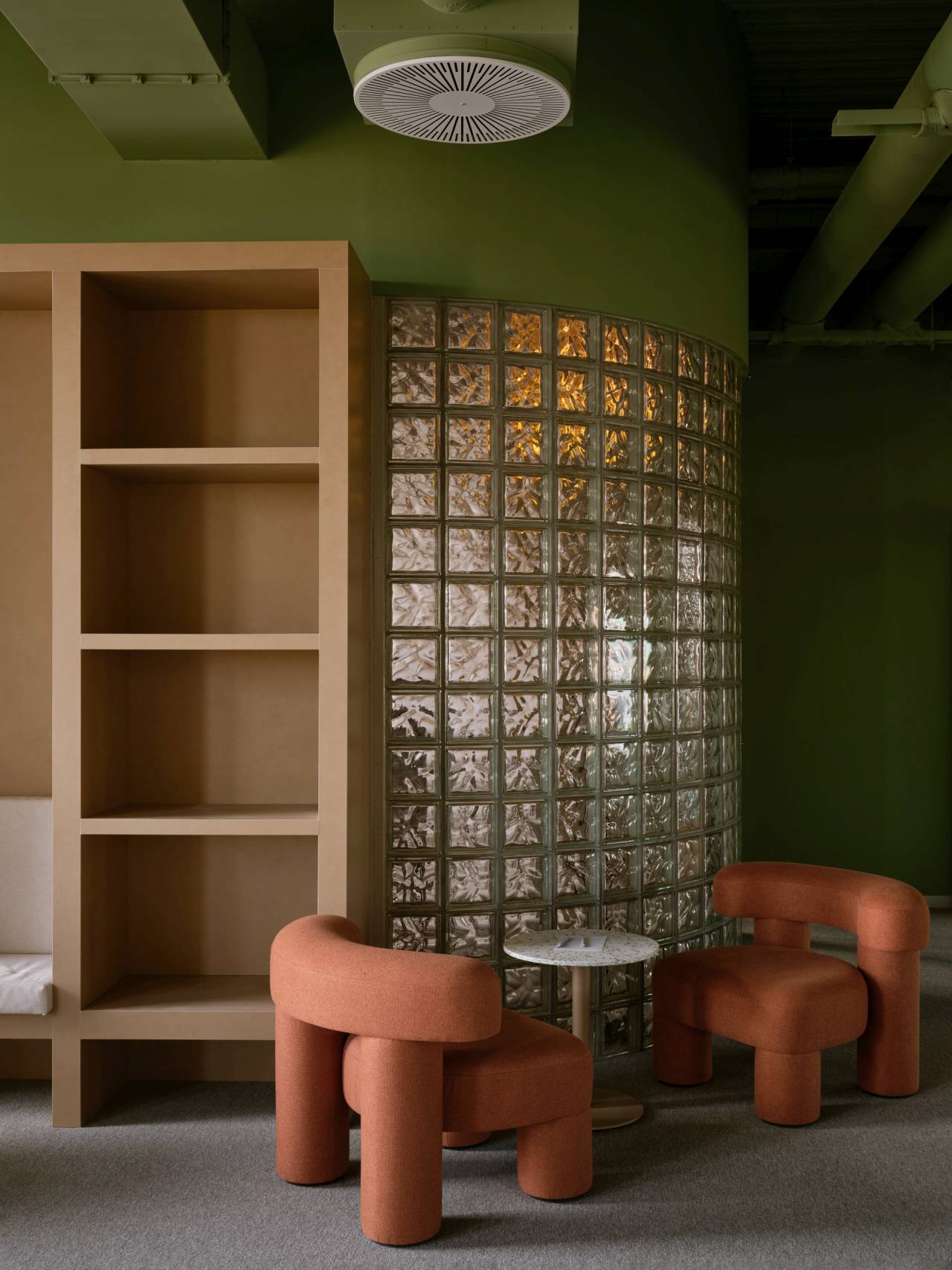 U zonama za odmor geometrija postaje mekša, a nameštaj i pregrade prelaze u radijusne forme. Ovaj kontrast u odnosu na racionalniji radni deo doprinosi opuštenijoj atmosferi i naglašava razliku u nameni prostora.