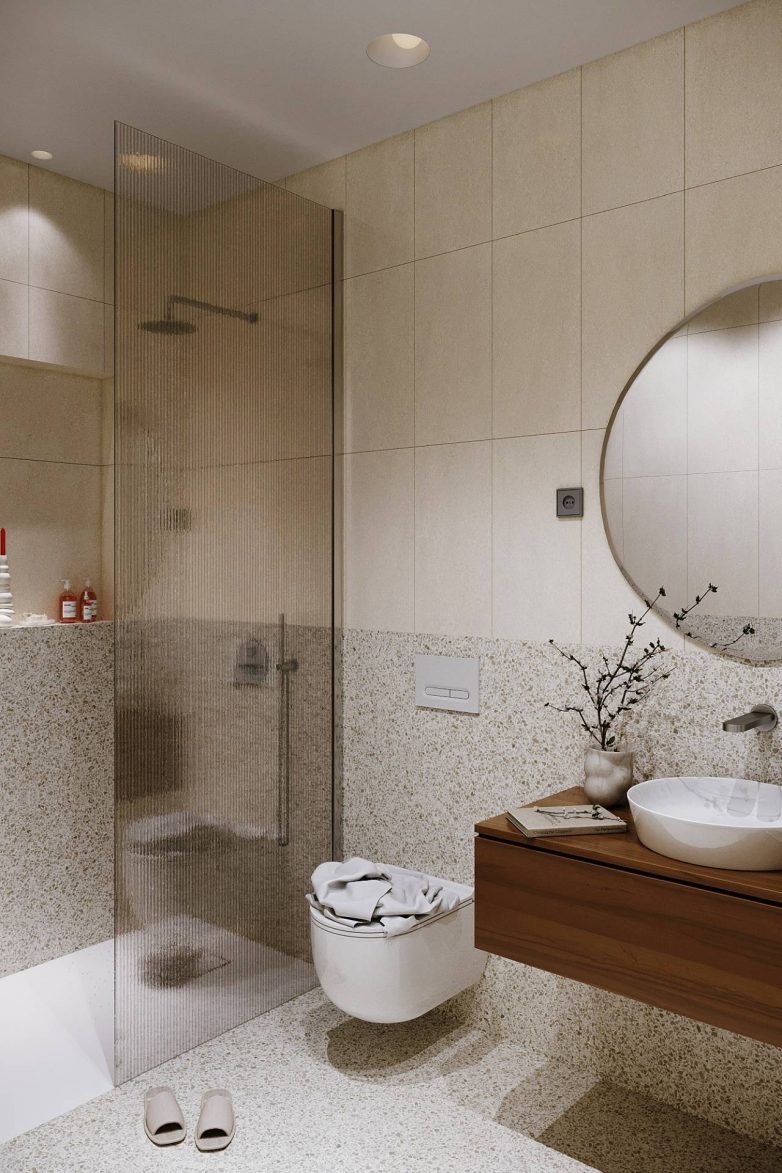 U kupatilima se priča nastavlja kroz primenu teraco tekstura i plavih detalja, čime se postiže kohezija sa ostatkom stana.