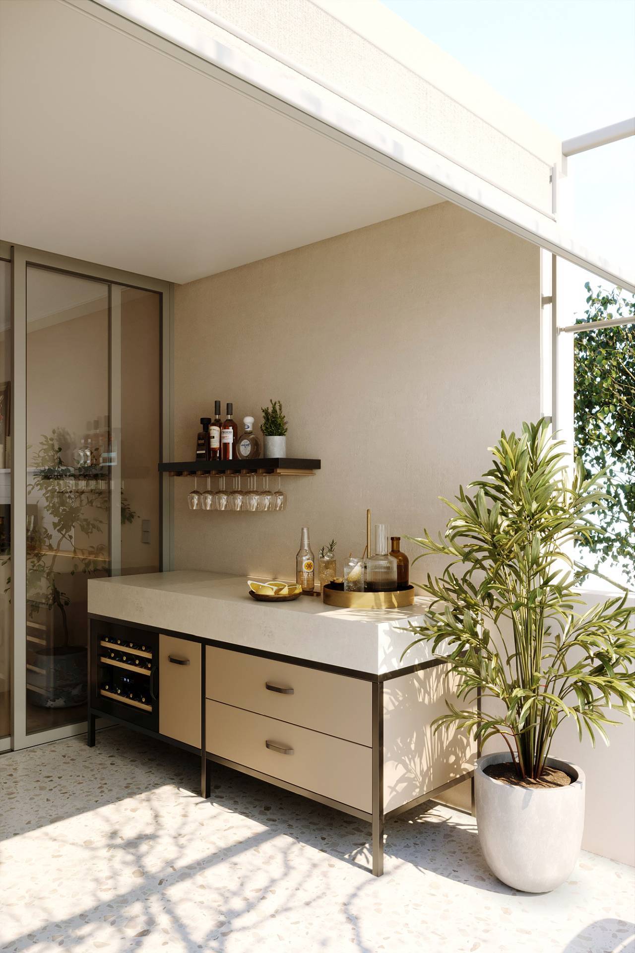 Jedan od najupečatljivijih delova projekta CLÉ-RM 20 je balkon, podeljen na natkriveni i otvoreni segment. Ovaj produžetak dnevnog prostora funkcioniše kao mesto susreta i opuštanja – jednako pogodan za koktele sa prijateljima, kao i za jutarnju kafu uz pogled na zelenilo koje ga okružuje.