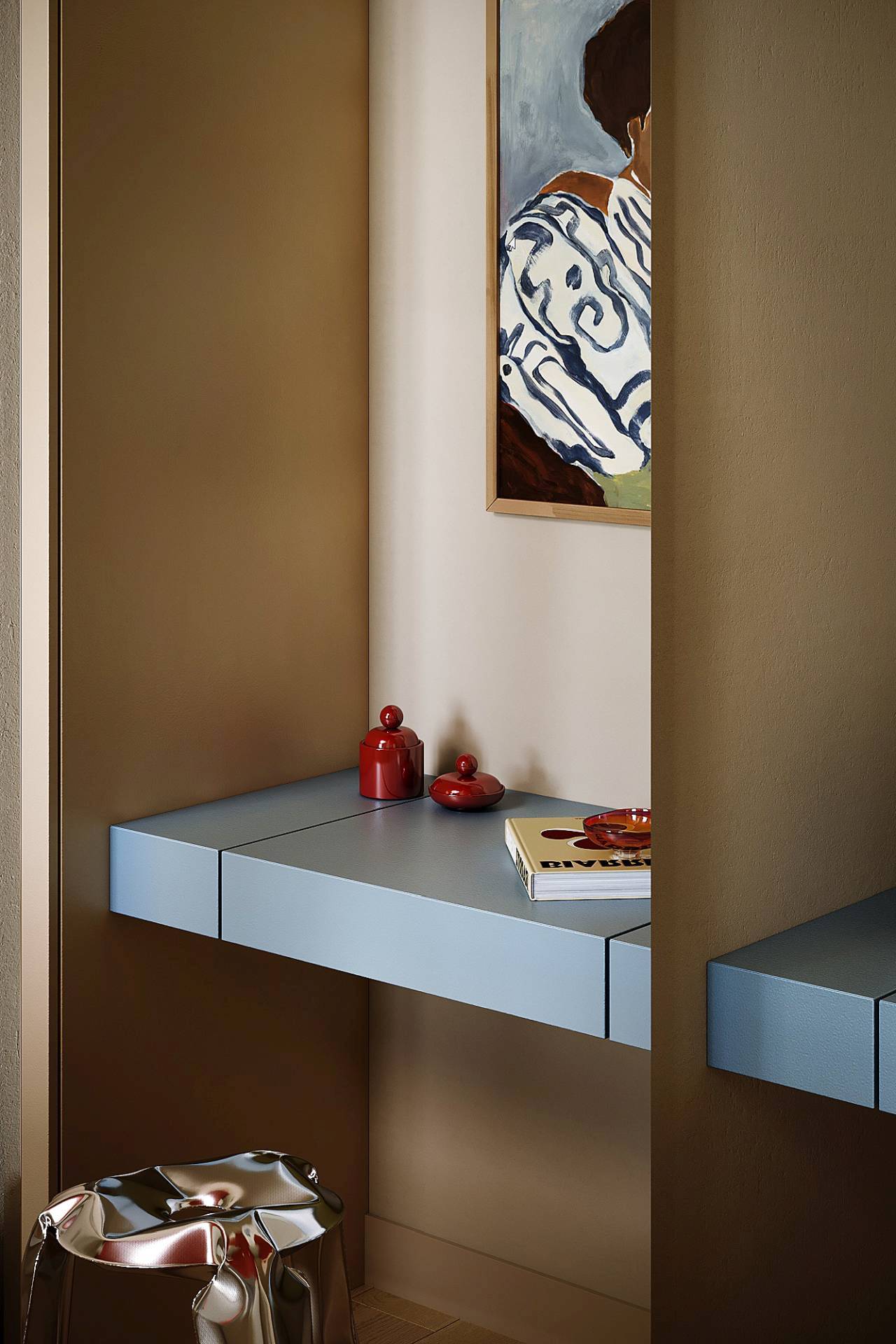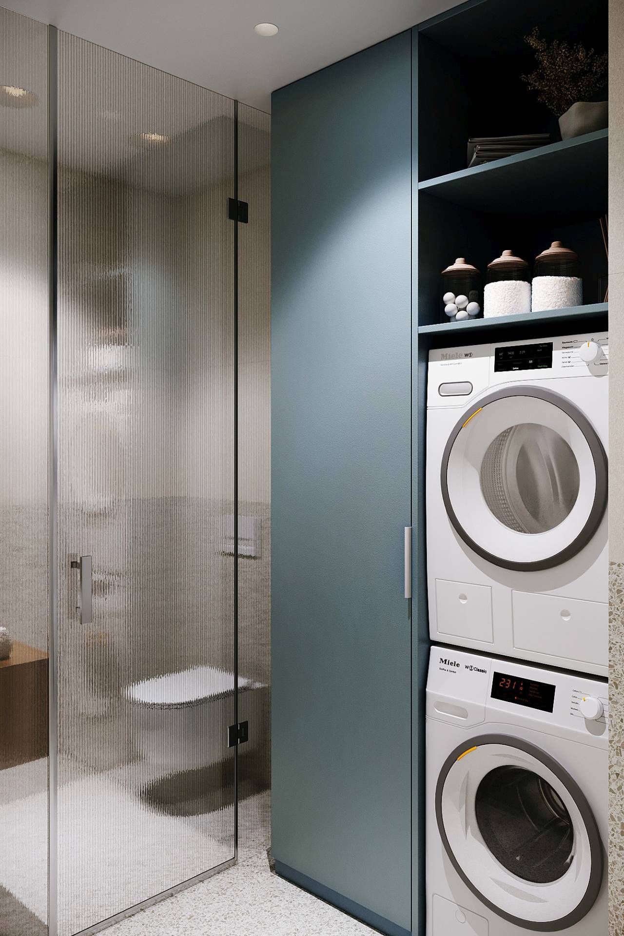 U kupatilima se priča nastavlja kroz primenu teraco tekstura i plavih detalja, čime se postiže kohezija sa ostatkom stana.