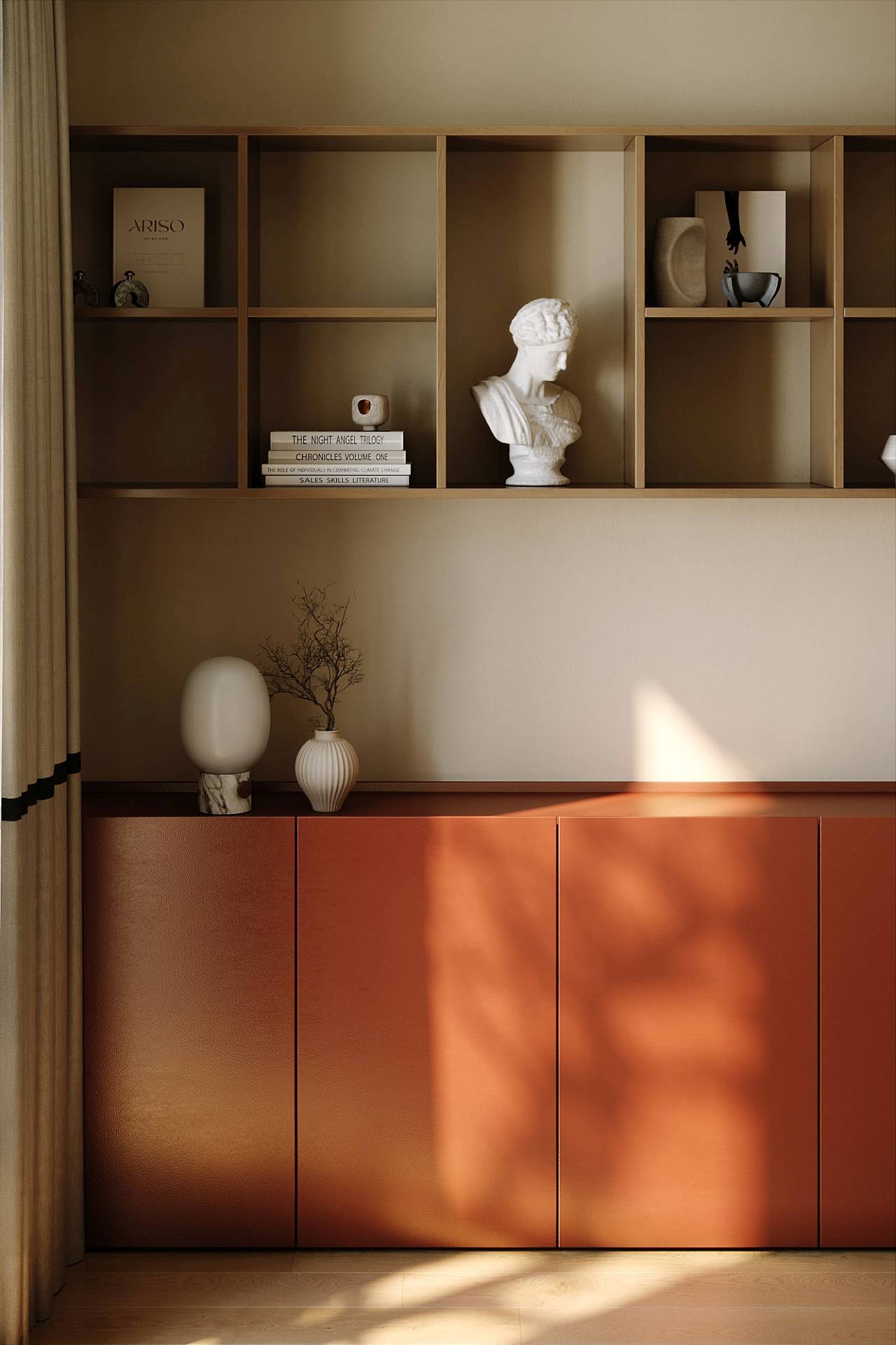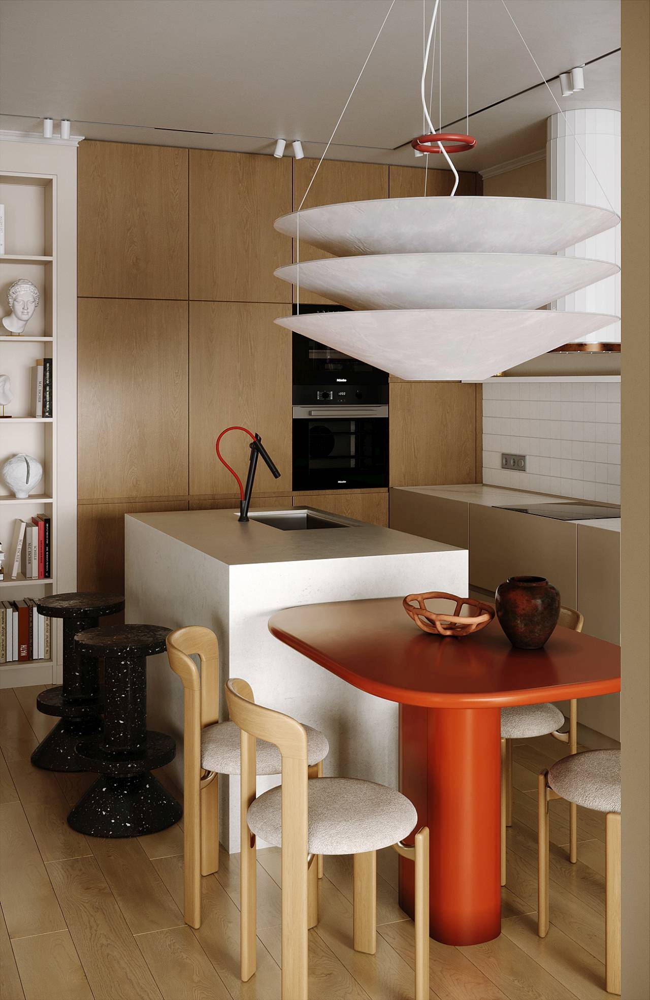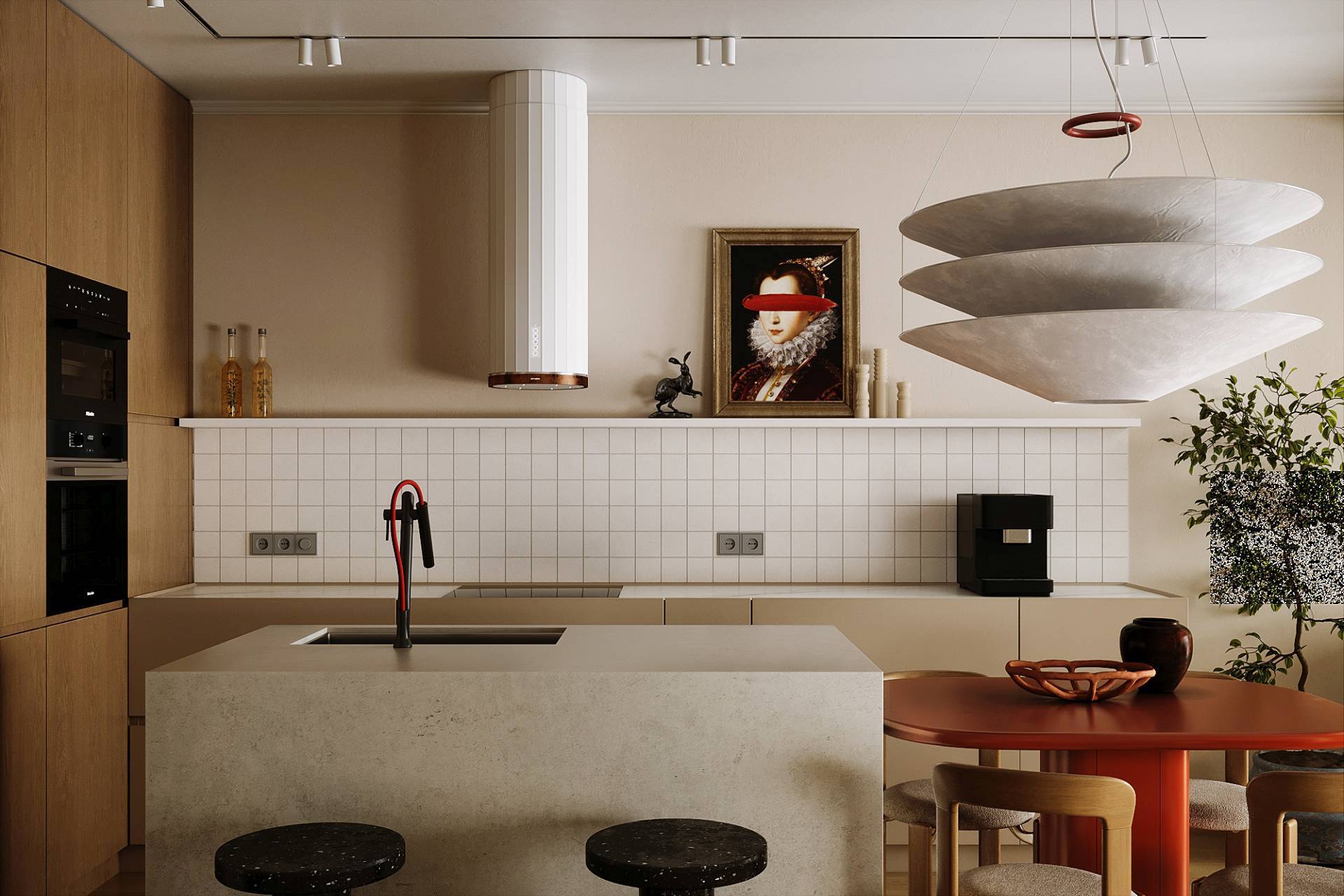 Otvorena kuhinja postavljena je kao centralni prostor stana. U kombinaciji orahovine i šampanj tonova, ona stvara toplu osnovu svakodnevnih rituala. Njen skulpturalni karakter dodatno naglašava rasveta, dok diskretni crveni akcenti unose dinamiku.