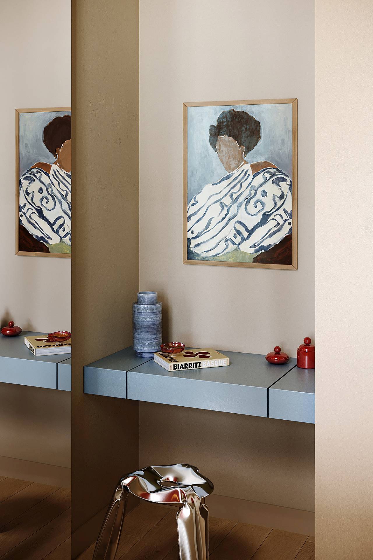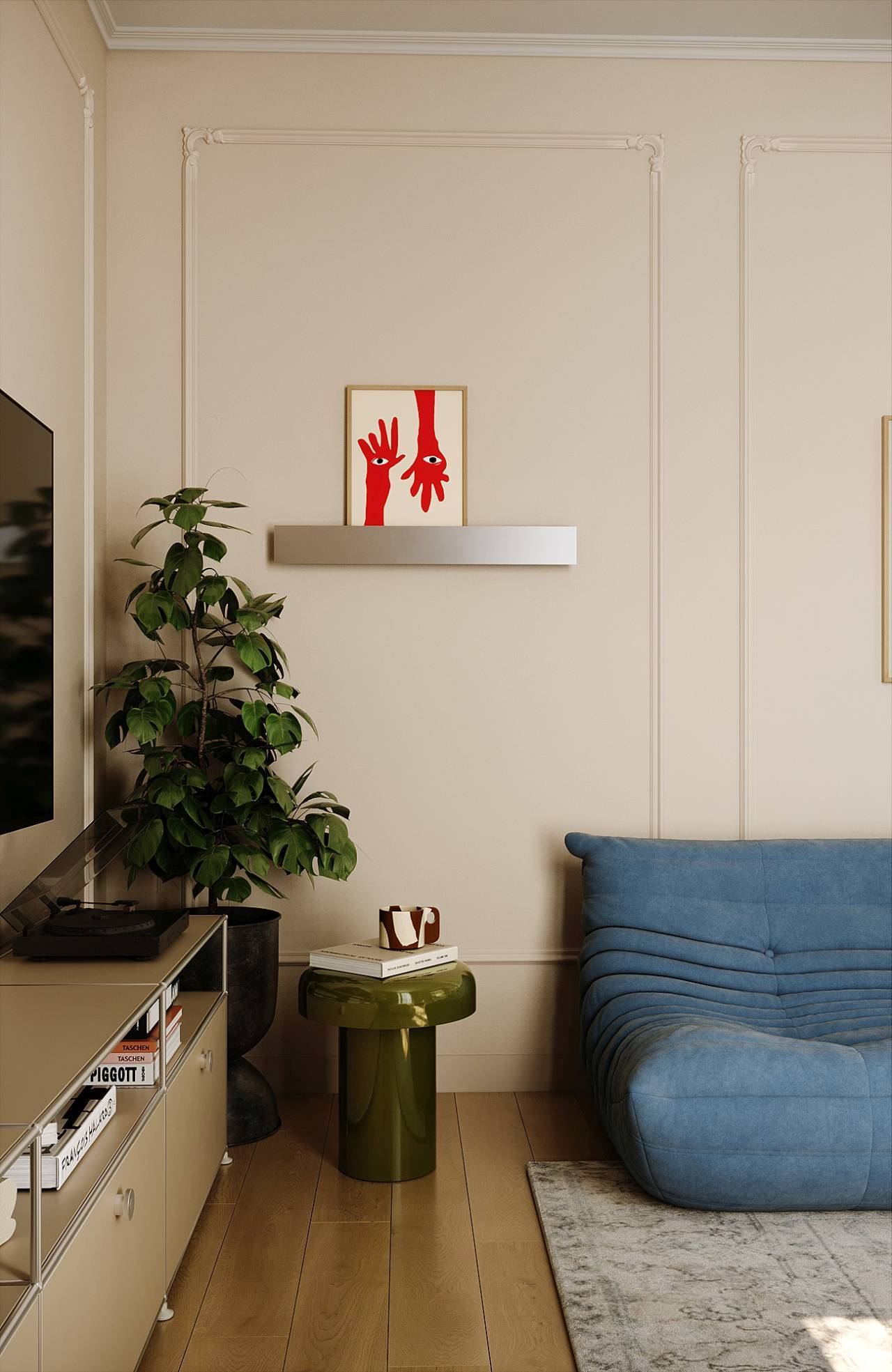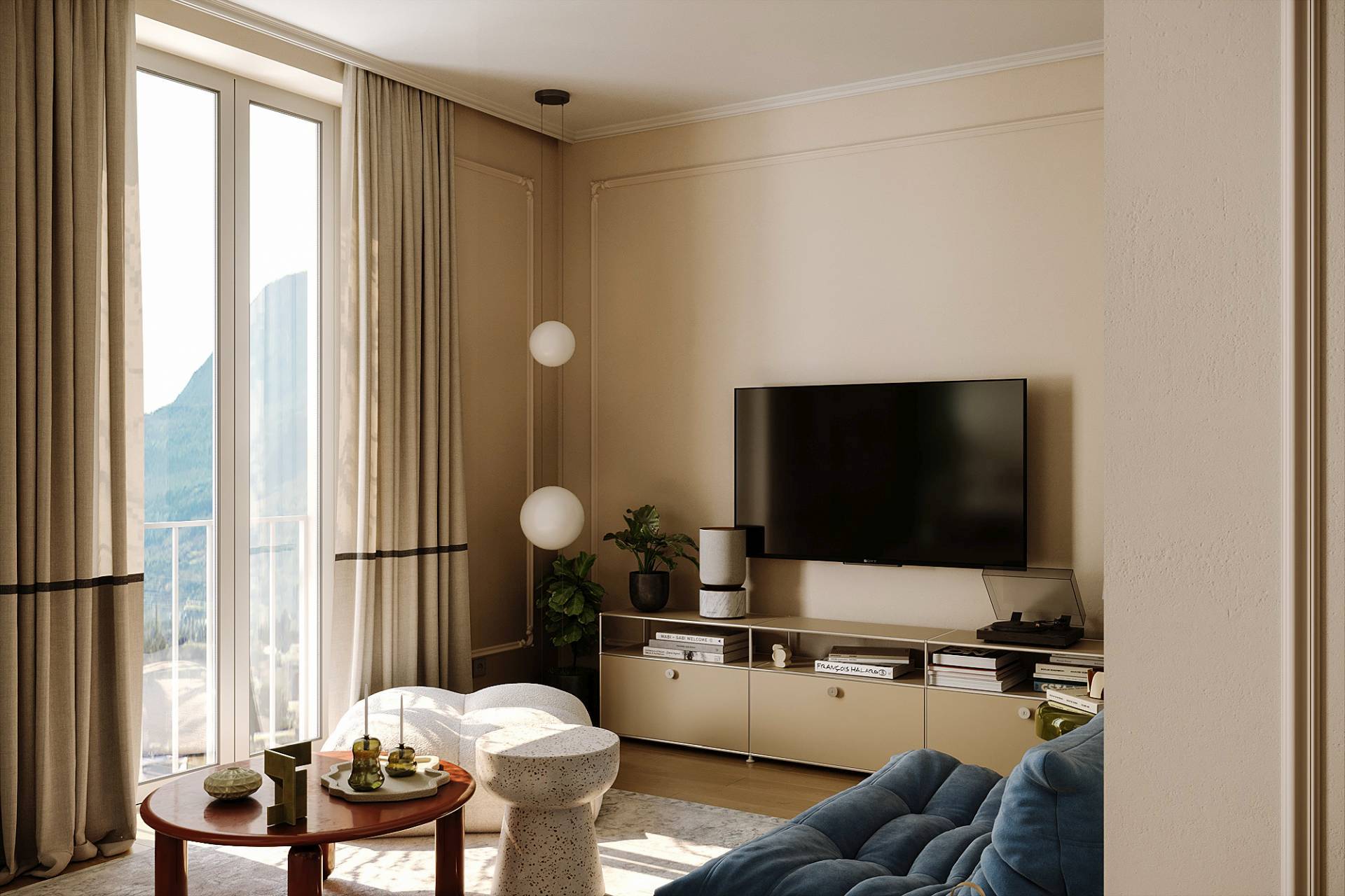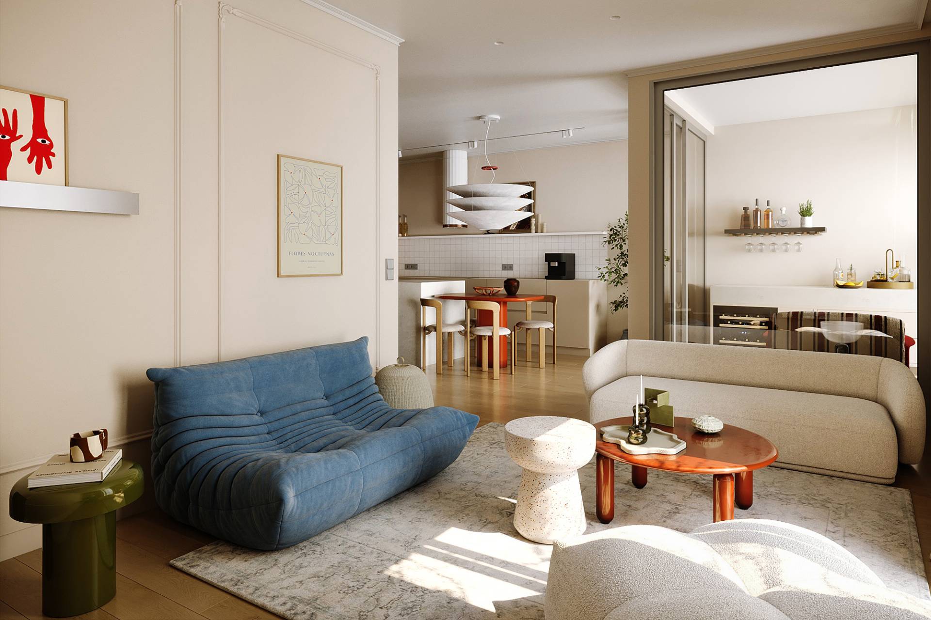 Naspram kuhinje, dnevni boravak donosi opušteniju atmosferu: prepoznatljiva fotelja u plavoj nijansi i zidne štukature prizivaju duh pariskih enterijera, povezujući tradiciju sa savremenim izrazom.