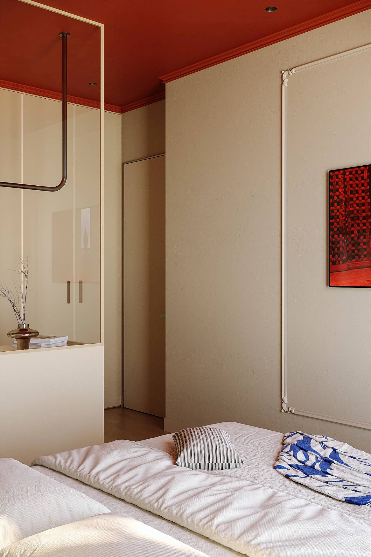 Spavaća soba donosi neočekivan obrt – intenzivno crveni plafon u kombinaciji sa apstraktnom tapetom i plavim detaljima stvara snažan, gotovo scenografski ambijent.