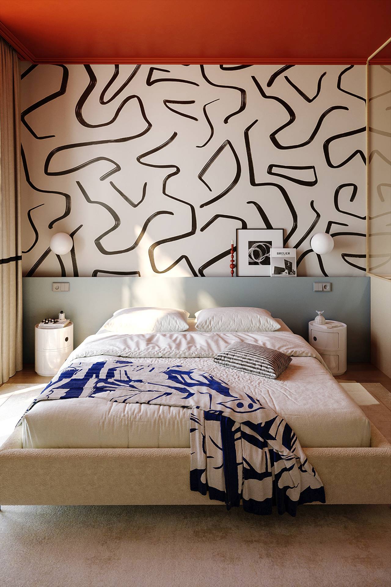 Crveni plafon, apstraktna tapeta i plavi detalji u spavaćoj sobi stvaraju gotovo scenografski ambijent.