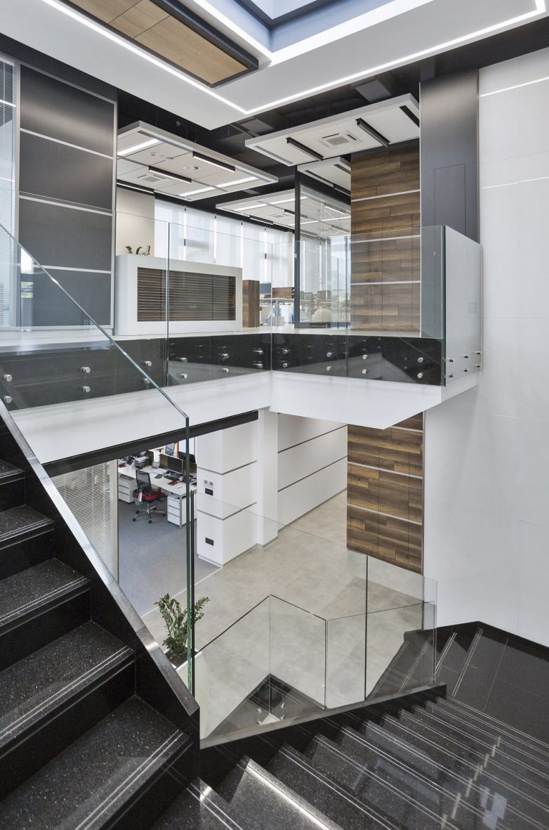 Centralno stepenište od crnog granita naglašava vizuelno prožimanje etaža i transparentnost staklenom ogradom.