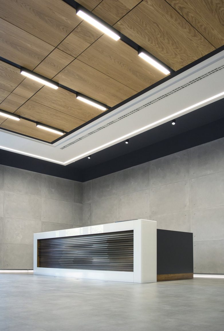Superponiranjem betonskih panela i drvenih obloga, zidnih površina u beloj i boji antracita, modularnog plafona i staklenih pregrada, u projektu se traži način da se prostor oplemeni i pobegne od uniformnosti.