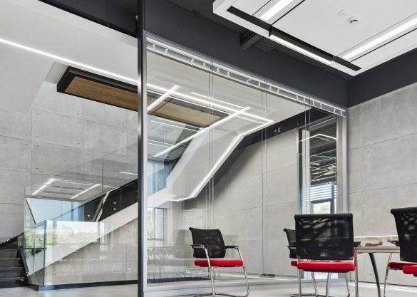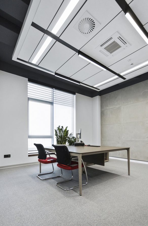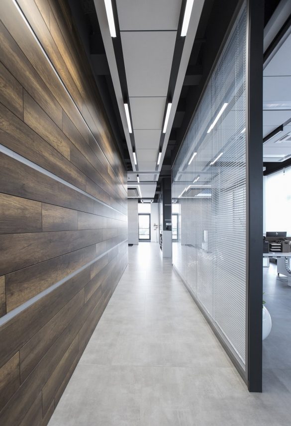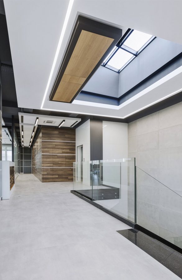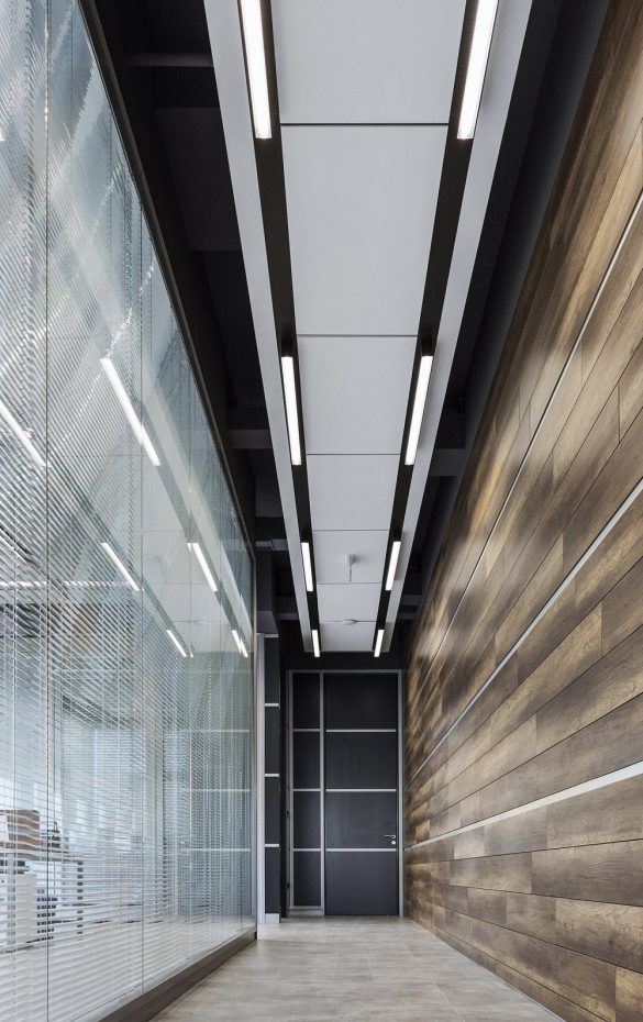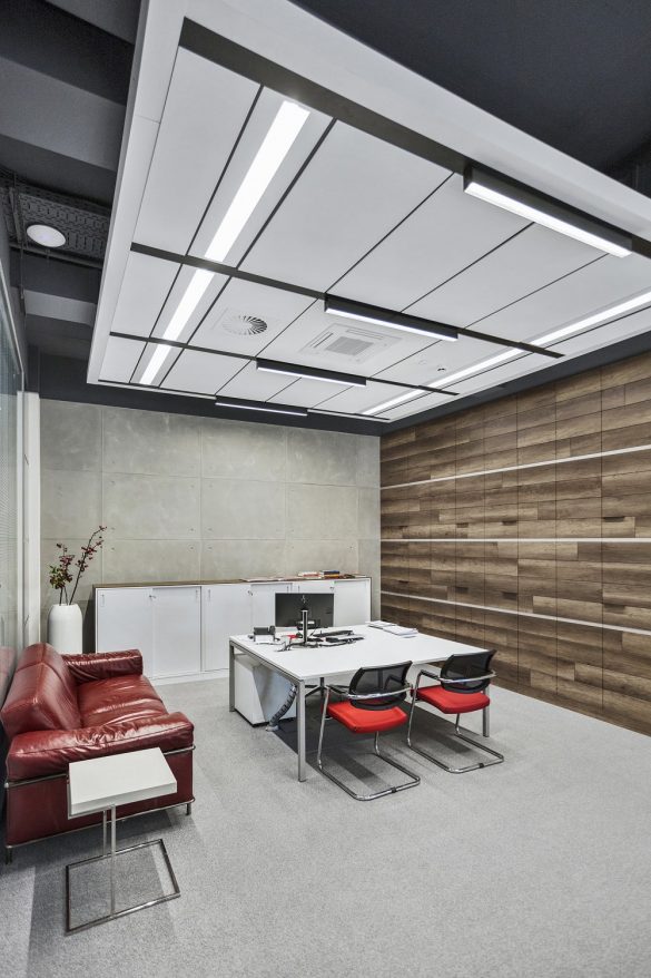 Superponiranjem betonskih panela i drvenih obloga, zidnih površina u beloj i boji antracita, modularnog plafona i staklenih pregrada, u projektu se traži način da se prostor oplemeni i pobegne od uniformnosti.