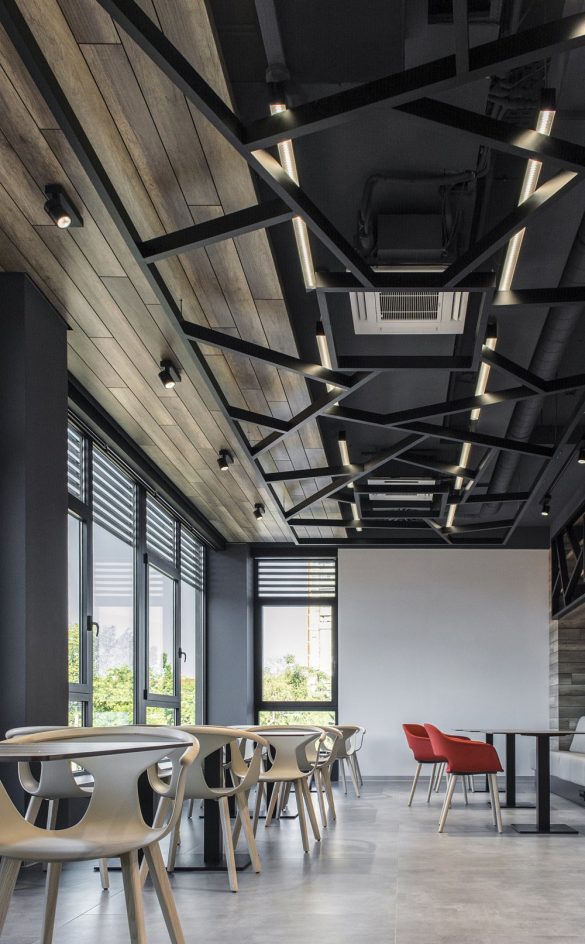 Kafeterija je projektovana tako da ima različit, opušteniji karakter od ostatka enterijera u skladu sa namenom ovog prostora, ali se i dalje zadržao izraz koji karakteriše prostor u sklopu poslovnog objekta.
